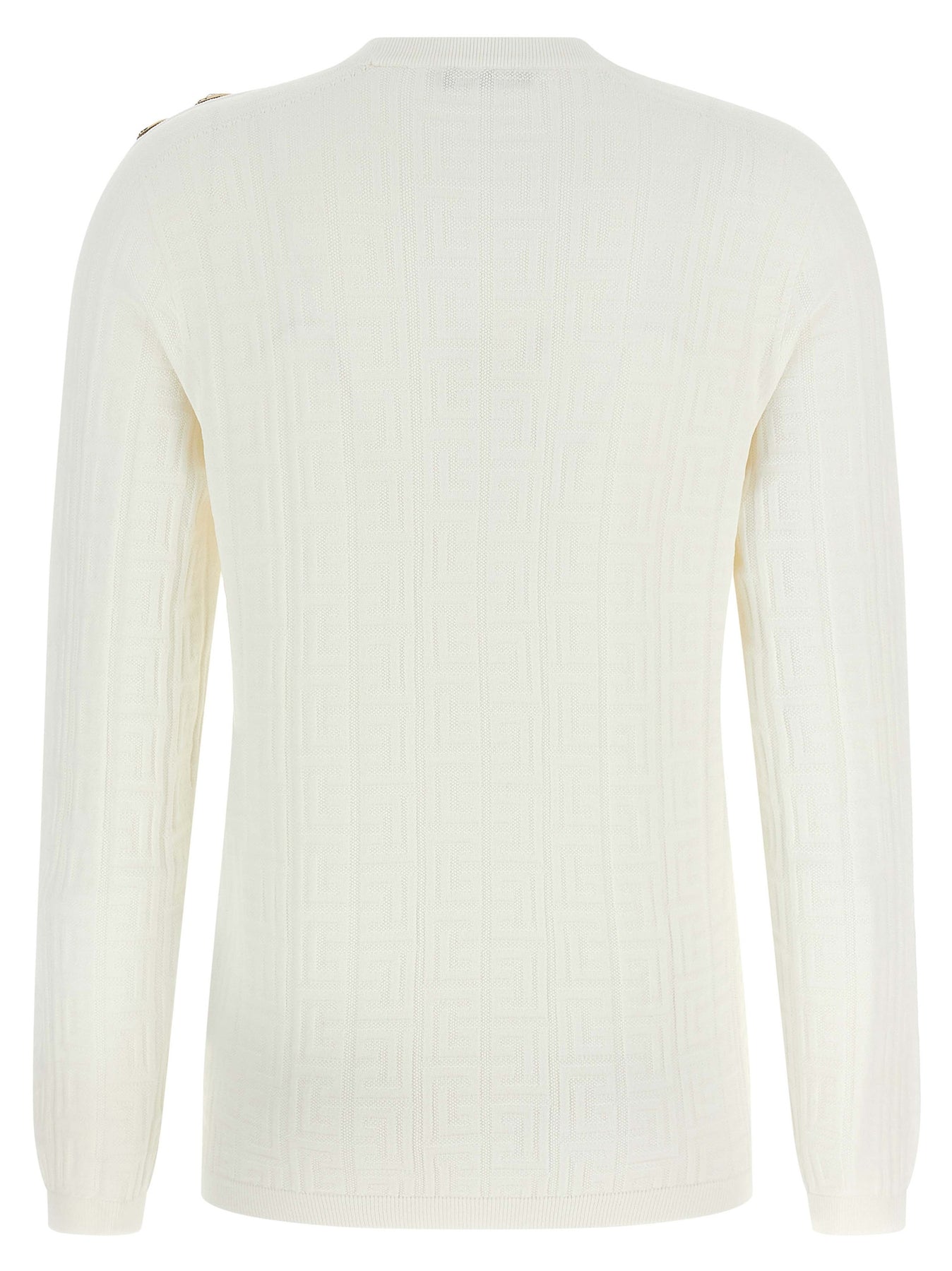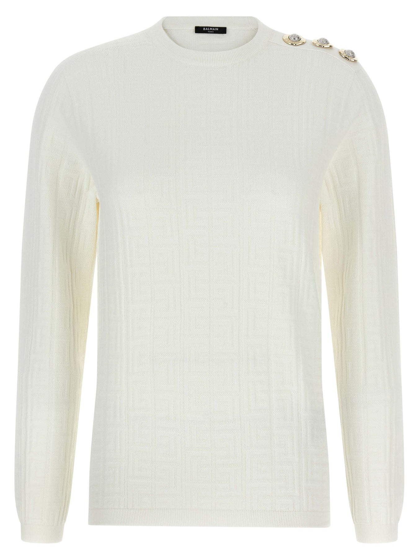 Stretch knit monogram jacquard logo top, decorative metal 'Gold and Silver Coin' buttons on the left shoulder, crew neck, long sleeves.