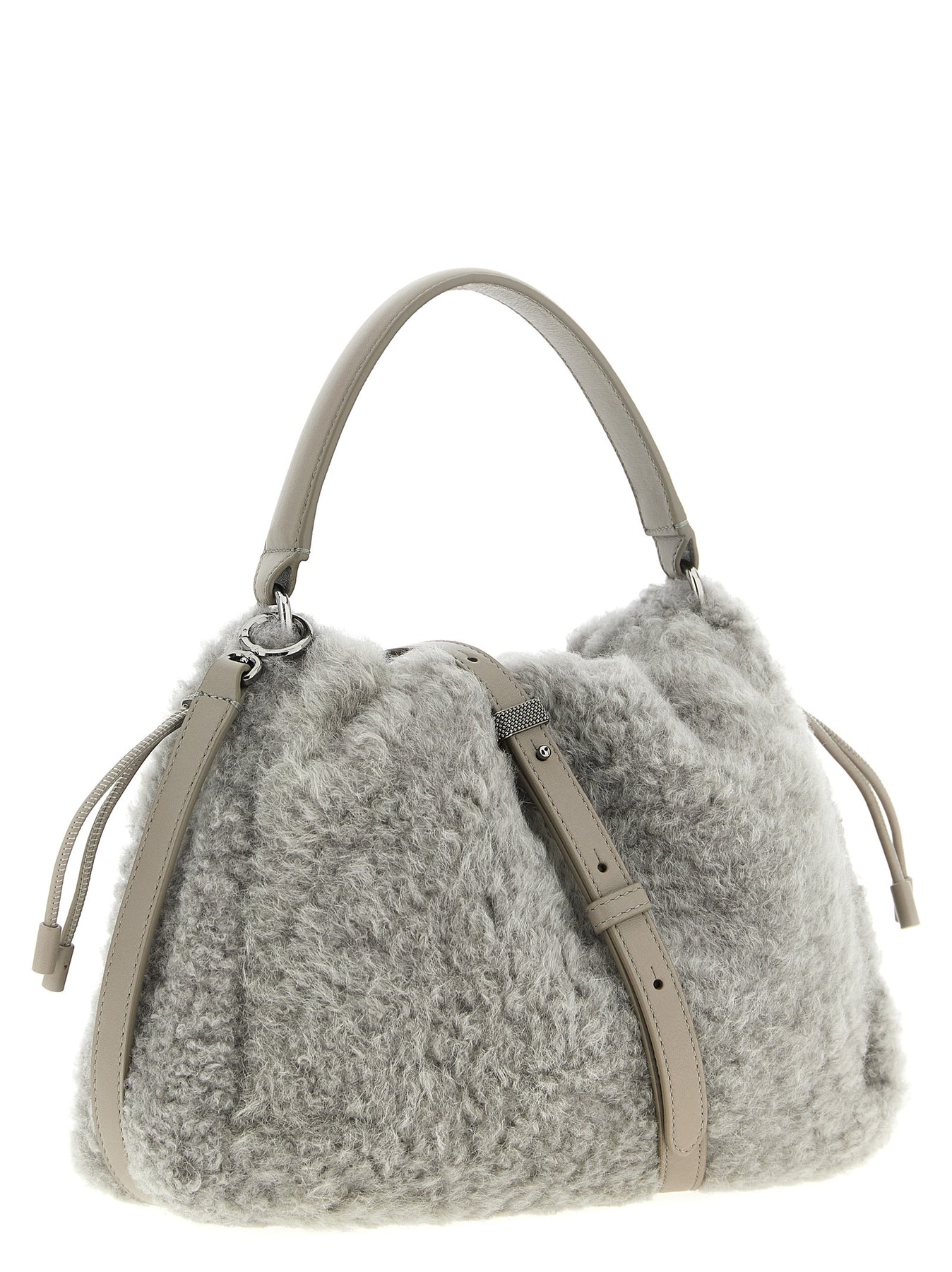 'Bucket Mellow' small Fuzzy shearling handbag with fixed leather handle, magnetic closure, drawstring with side Monile details, adjustable and removable leather shoulder strap, suede lining.