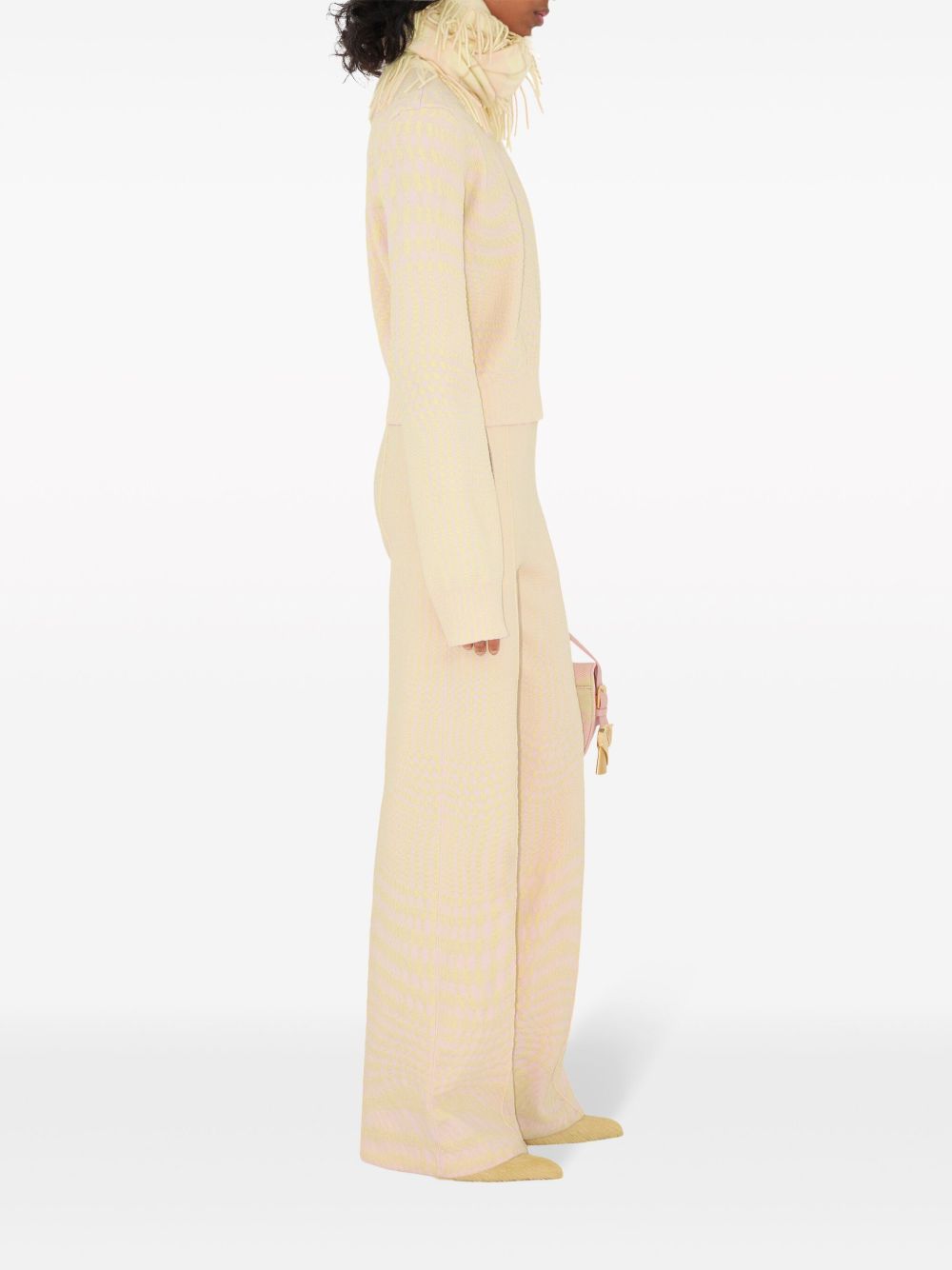 cream white/light yellow stretch-wool patterned jacquard warped and houndstooth pattern high split neck long sleeves ribbed cuffs and hem
