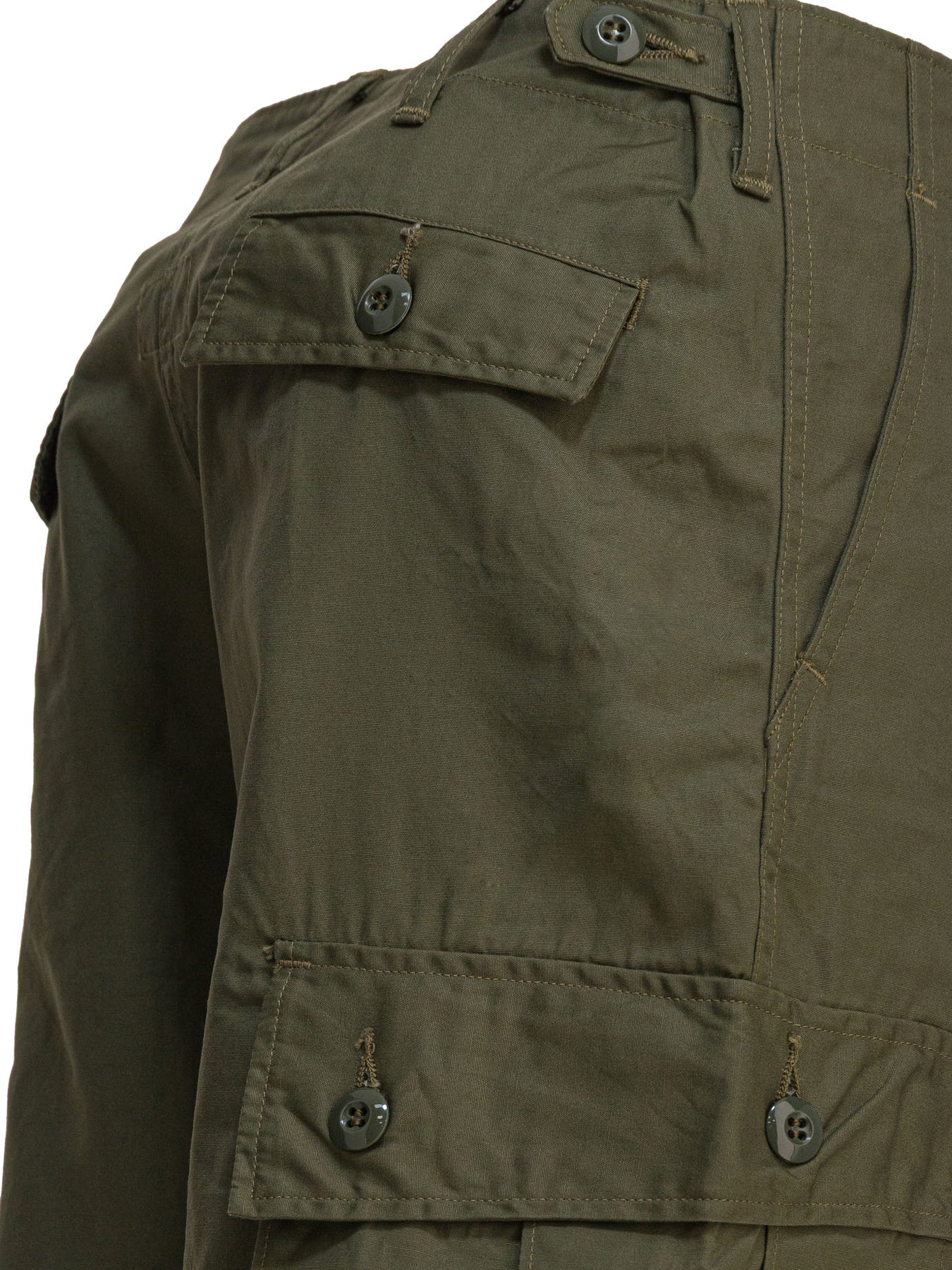 Buzz Rickson's cotton poplin cargo pants, constructed of tightly woven ripstop fabric. The construction features a wide silhouette, highlighted by side patch pockets and reinforced seams. Hidden buttons along the flap and no interior straps in cargo pockets. Adjustable waist via buttons with metal elements. Leg bottoms equipped with drawstrings for precise adjustment. Seams appear flat and regular. || - Solid color - Mid-rise - 100% cotton ripstop fabric - Hidden buttons on the flap - Absence of fastening straps in cargo pockets - Waist adjustment via buttons with metal elements - Adjustable drawstring at the ankle - Relaxed fit