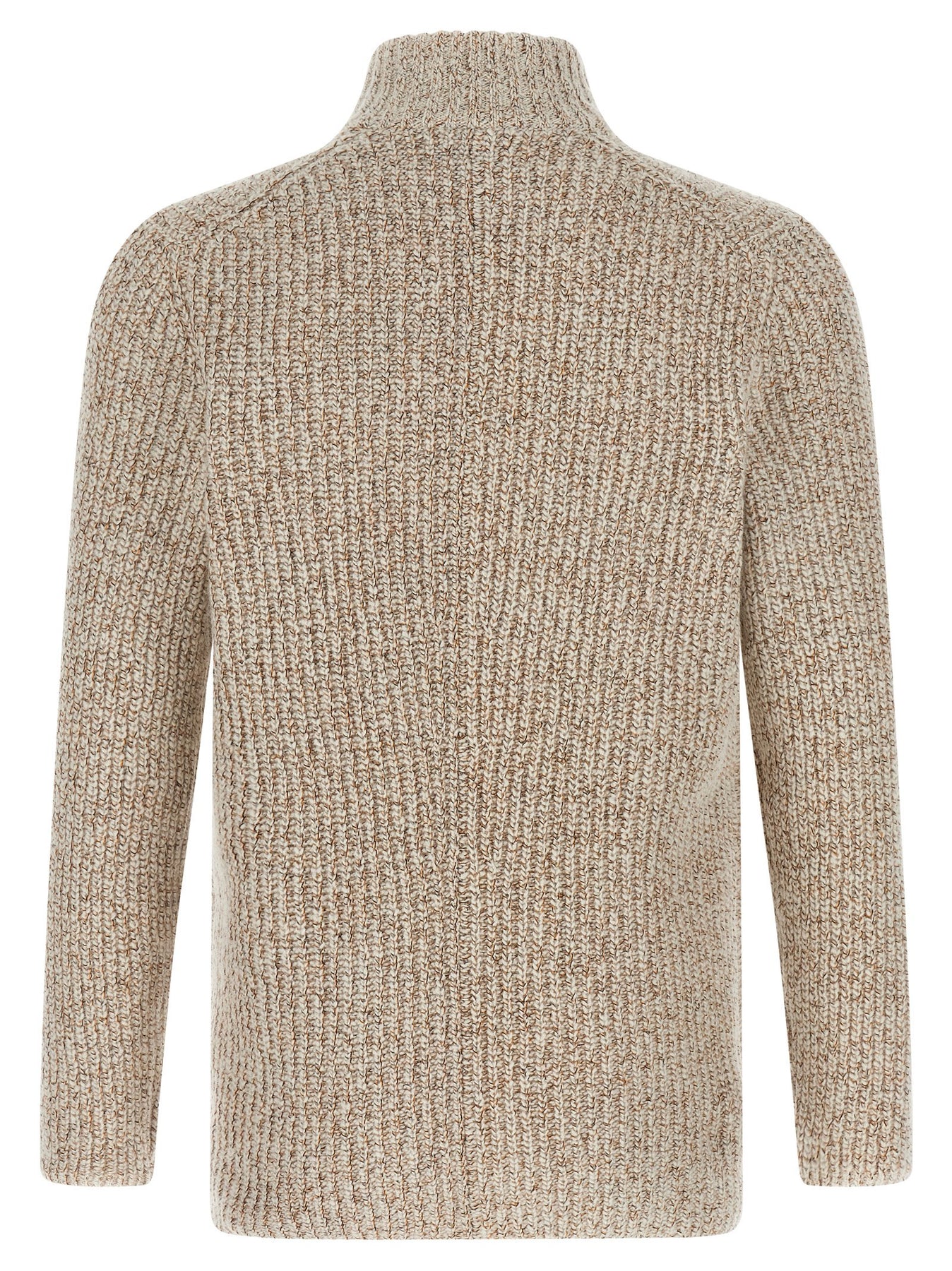 Mouliné virgin wool, silk and cashmere cardigan crafted half-English rib, one-and-a-half model with front metal button closure, high neck, long sleeves, pockets.