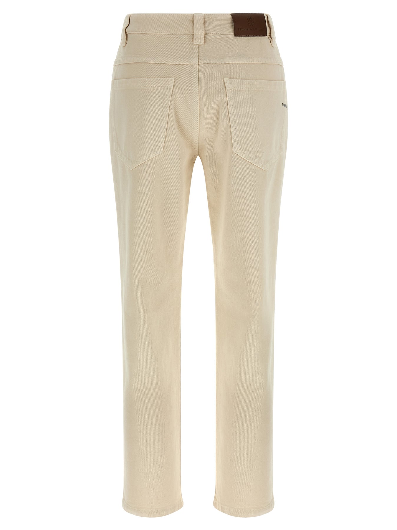 Five-pocket denim trousers, straight model, with jewel detail on the back, front button and zip closure.
