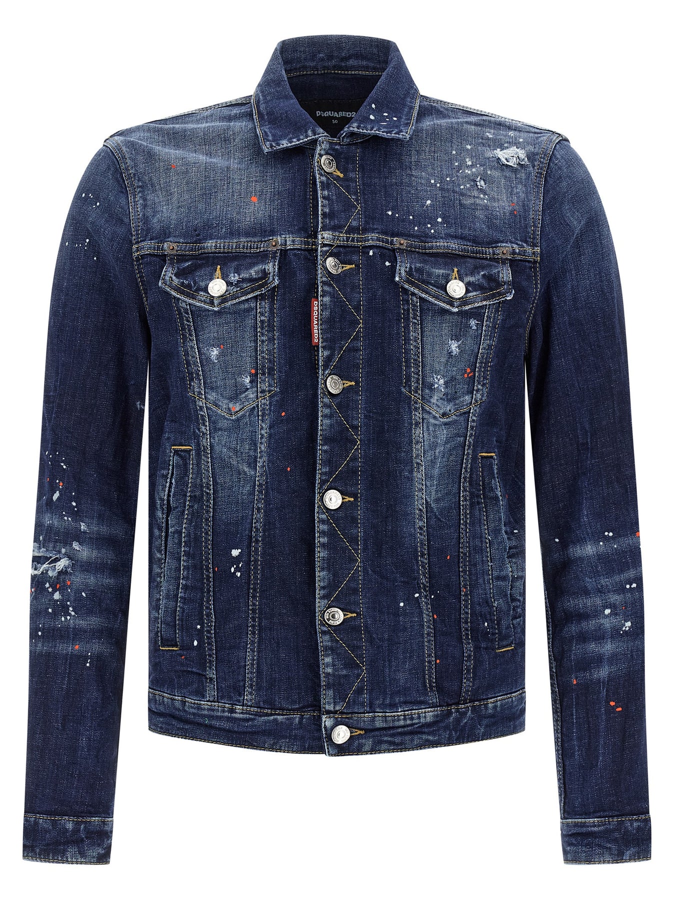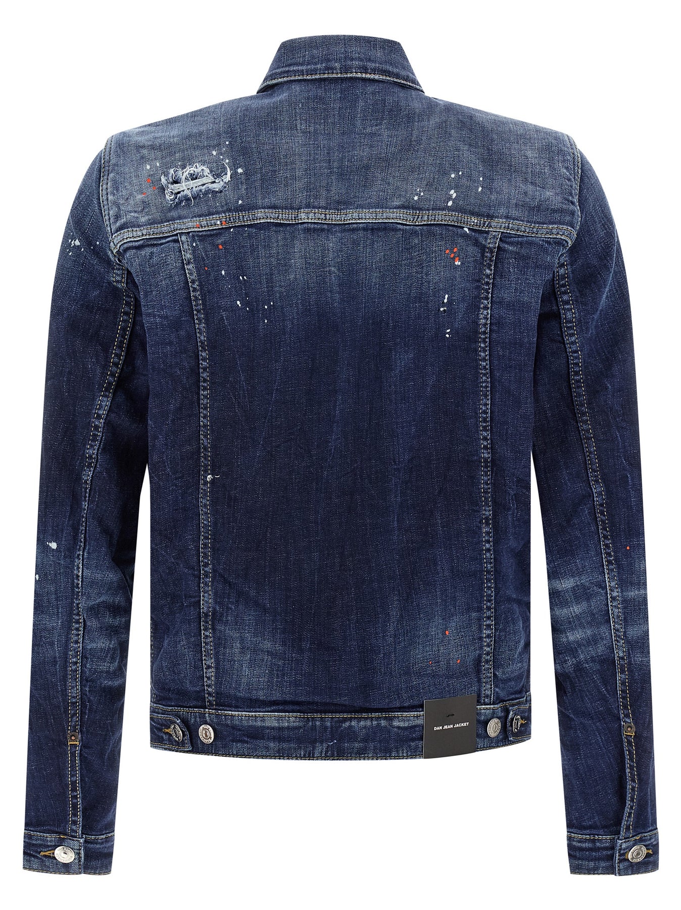 'Dan Jean' stretch cotton denim jacket with distressed treatment and patent leather splashes, shirt collar, front button closure, pockets, long cuffed sleeves.