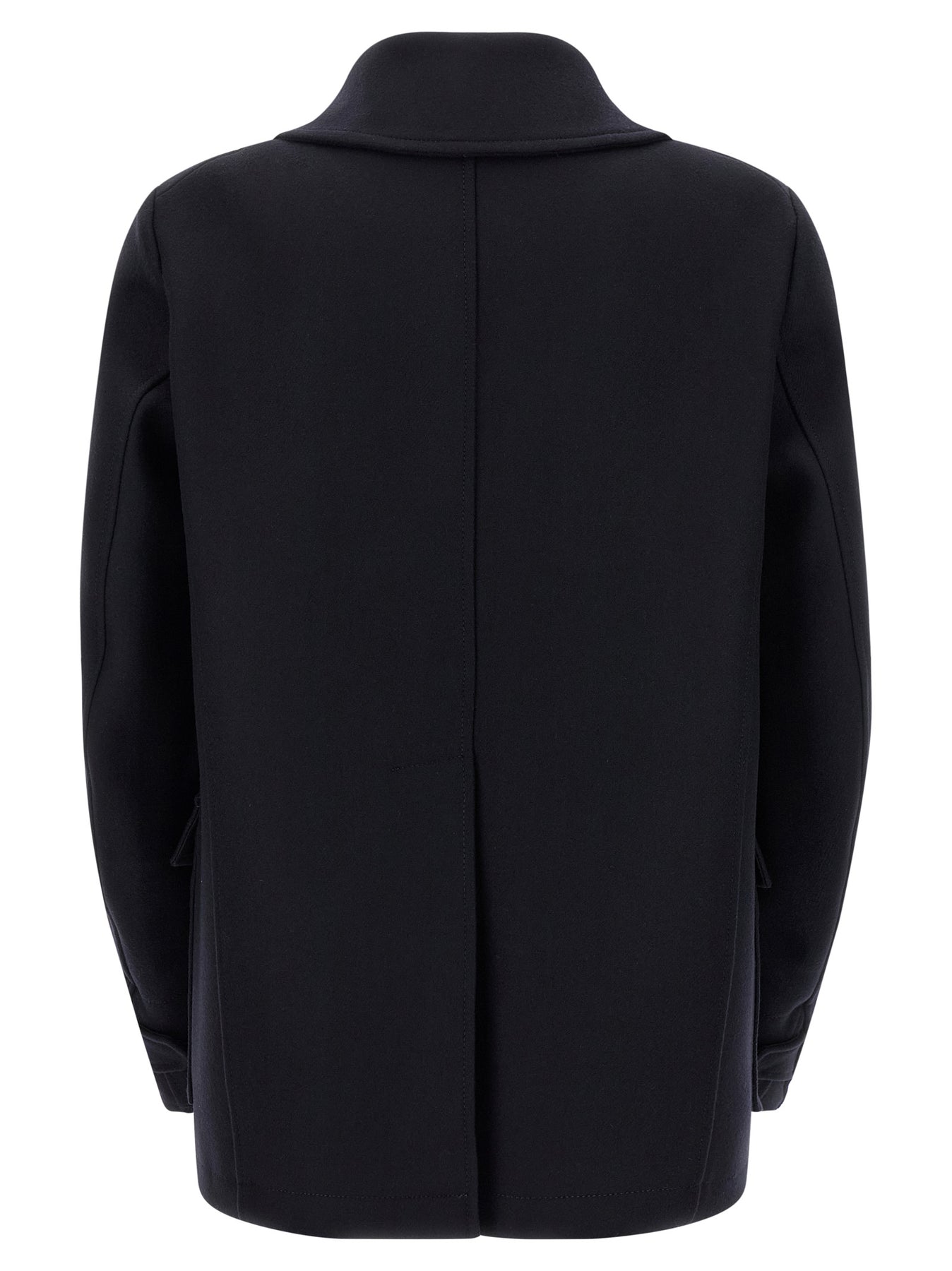 Felted wool caban coat, chinstrap collar, front button closure, pockets, long cuffed sleeves, back split, monogram fabric lining.