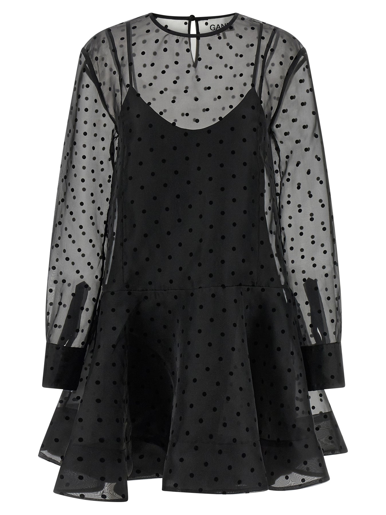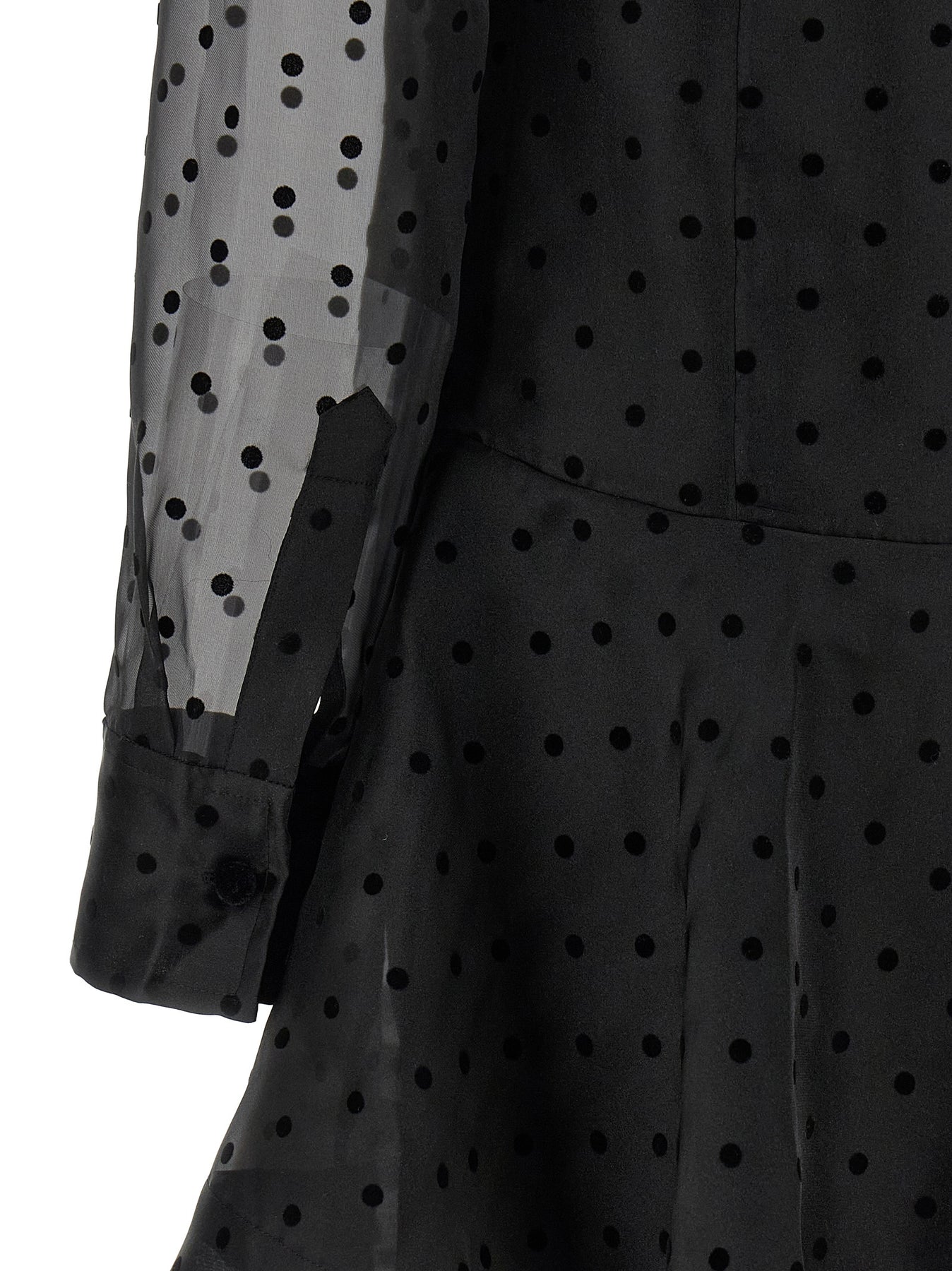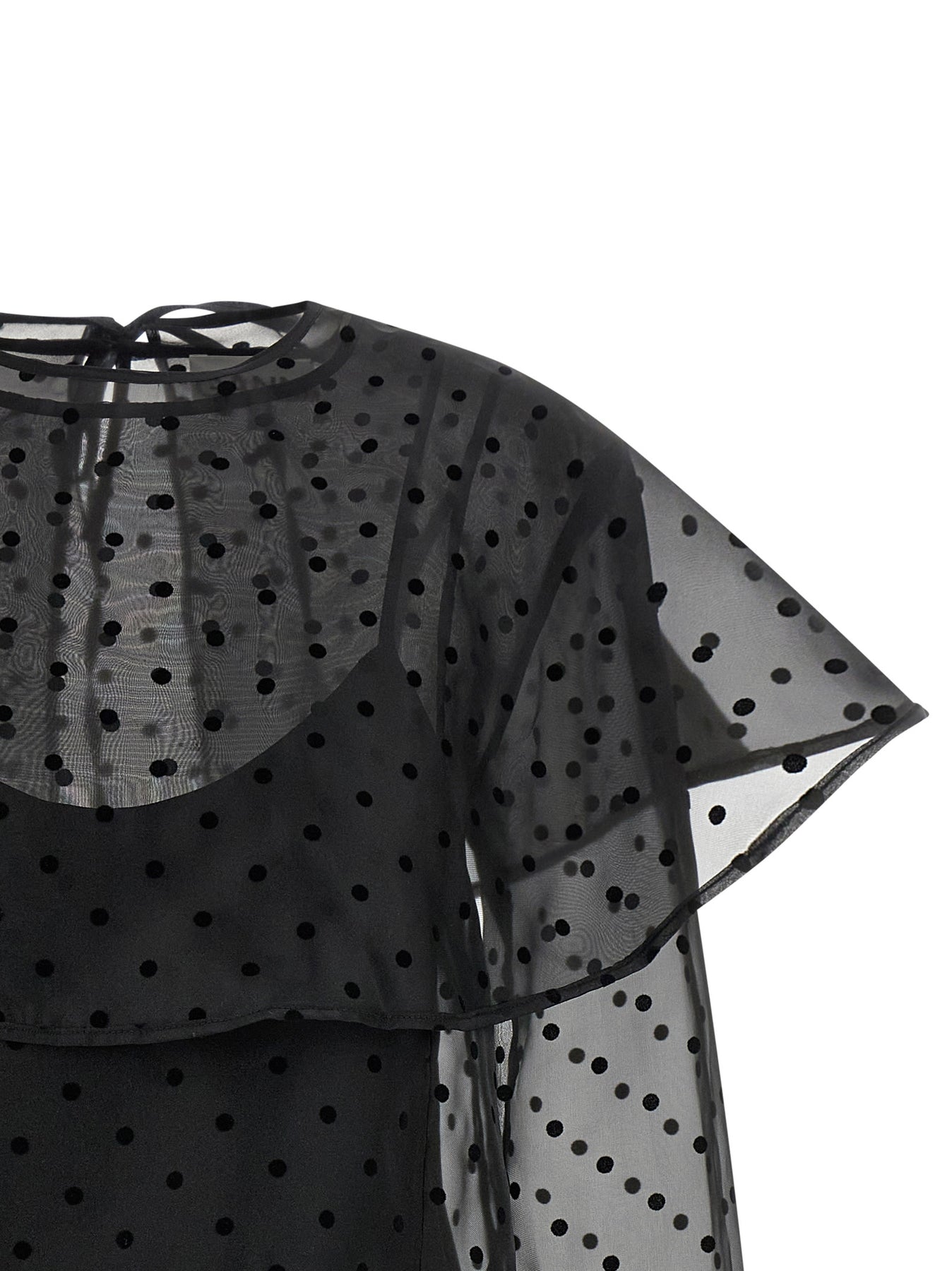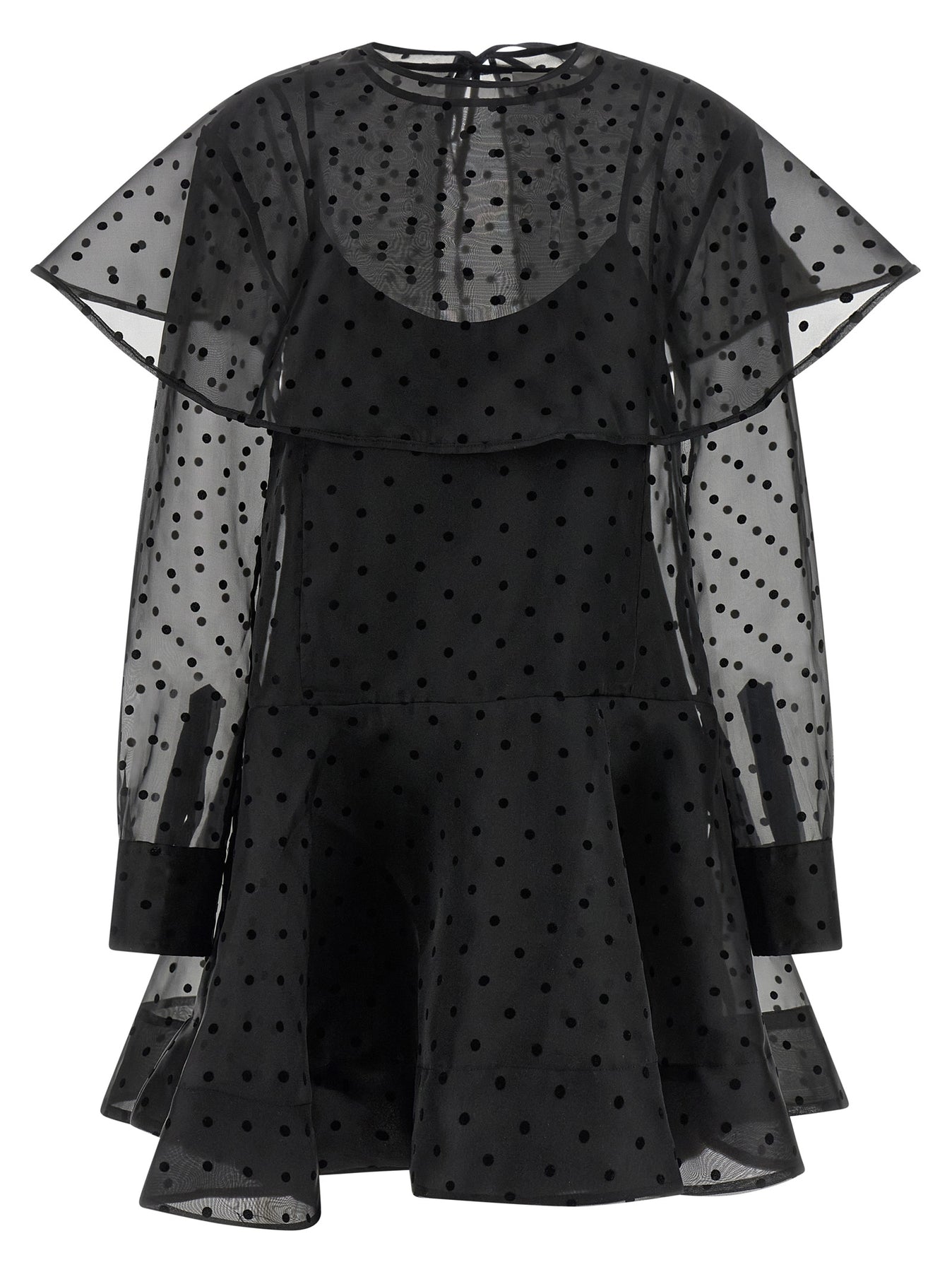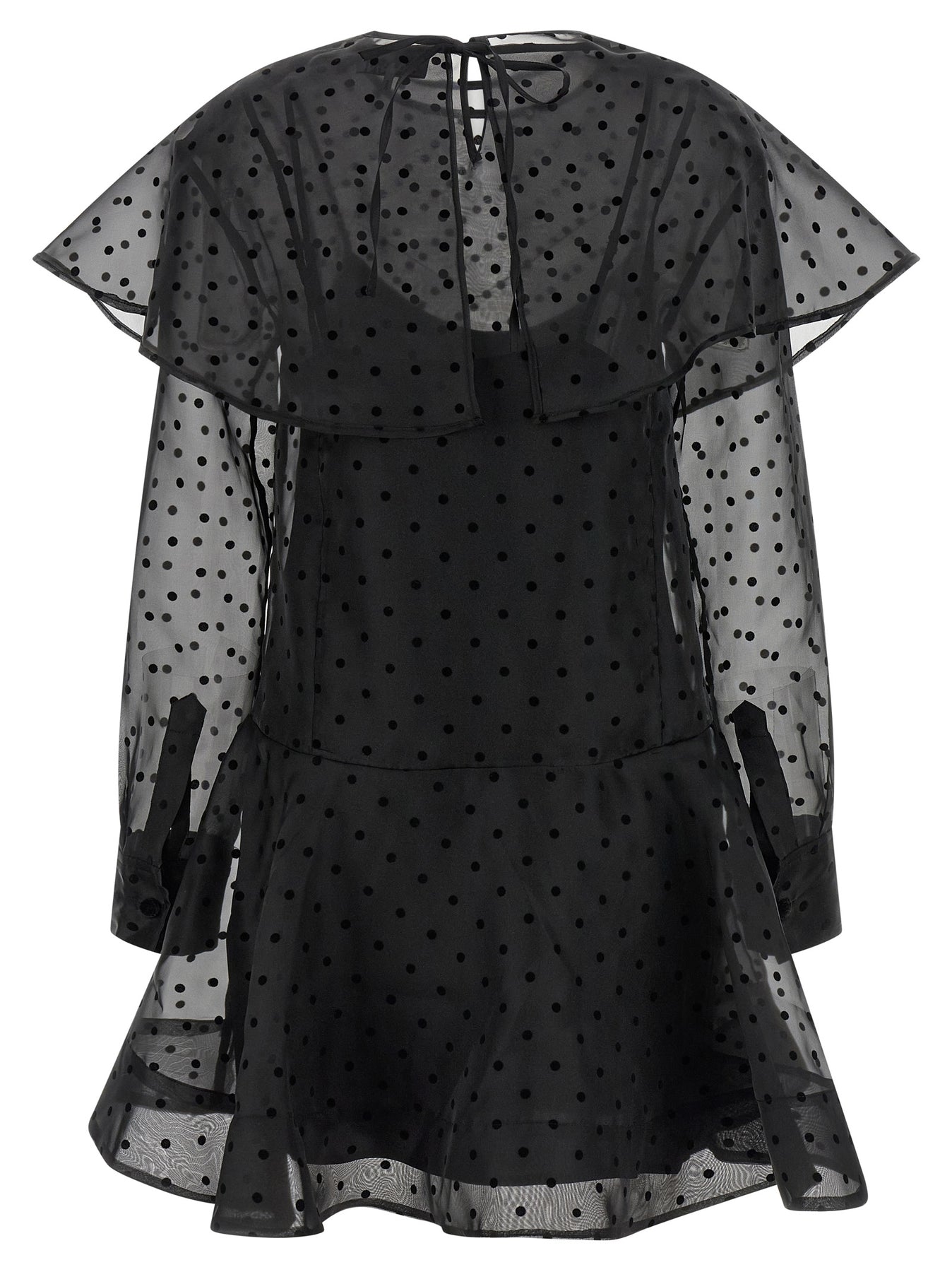 'Black Organza Circle Collar' minidress in semi-transparent polka dot organza, crew neck with button closure and back teardrop cut-out details, long cuffed sleeves, full skirt, maxi collar with removable drawstring closure, viscose petticoat with thin removable straps.