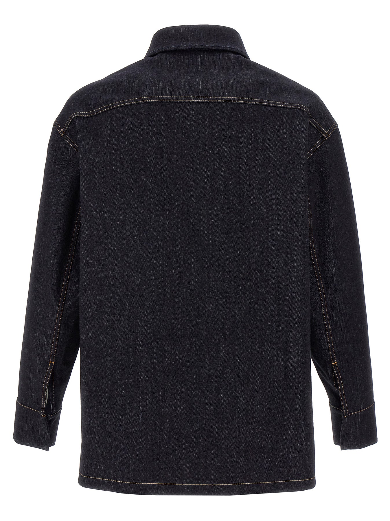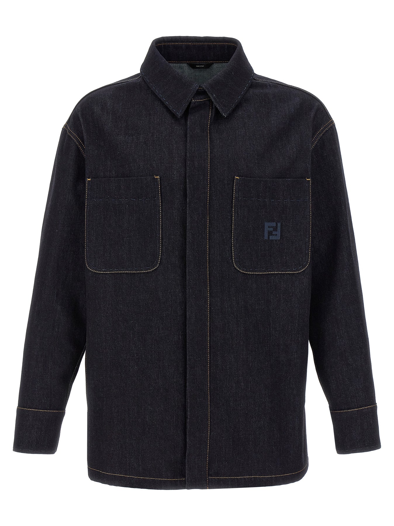 Denim fabric jacket, FF logo embroidery on the front pocket, straight design, tone-on-tone saddle stitching and contrast stitching, shirt collar, front snap button closure, pockets, long sleeves with cuffs and dropped shoulder.