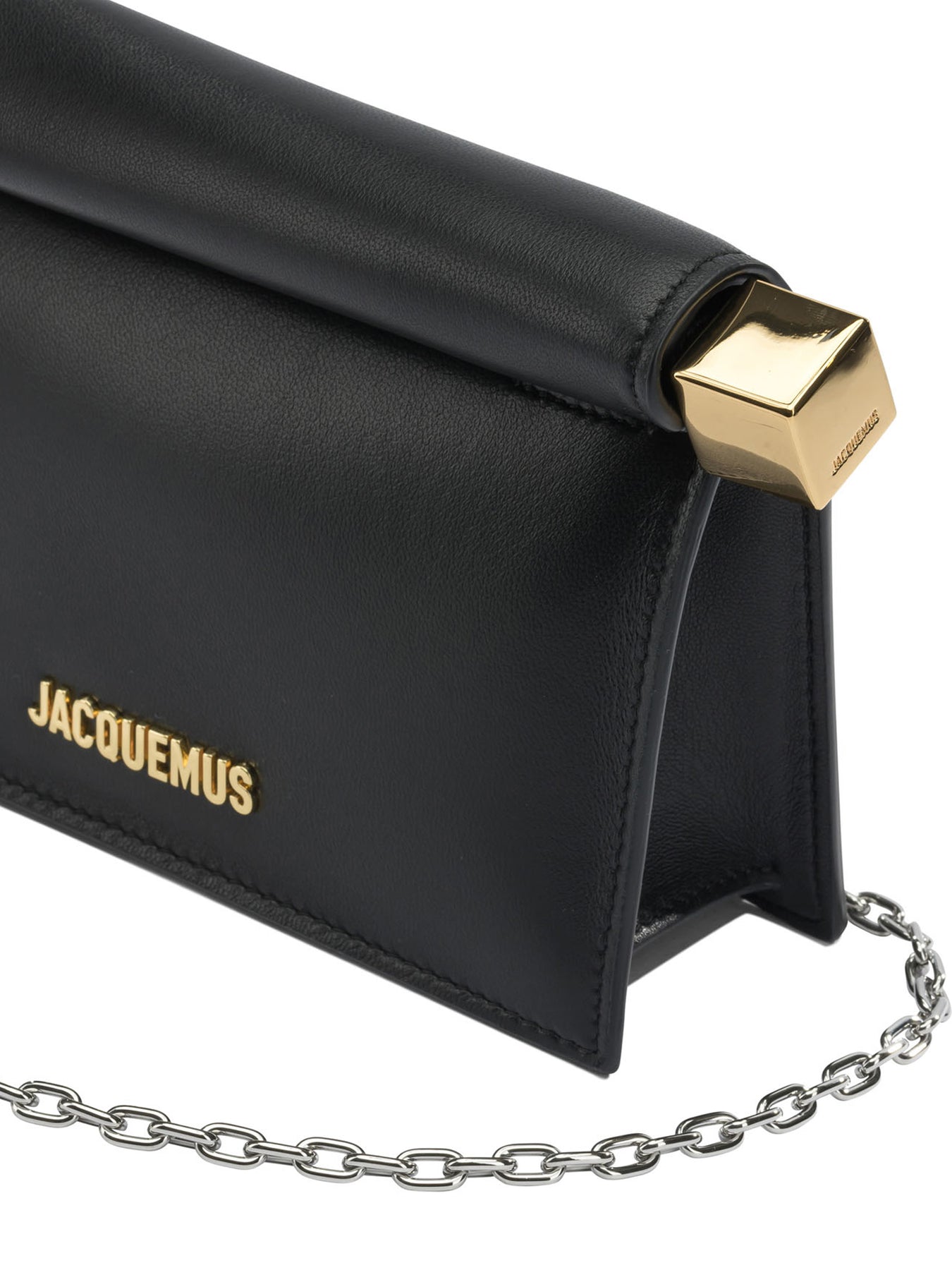 Jacquemus "La Petite Rond Carrè" clutch bag made of nappa leather with folded construction. The compact silhouette houses an interior structure accessible by unrolling the body of the bag. The distinctive elements of the closure consist of a silver metal circle and a large gold metal square applied at the ends. Internally there is a dedicated credit card pocket and gold metal trim. The lining is made entirely of cotton. || - Folded tassel structure - Closing elements: silver metal hoop and gold metal square - Magnetic closure - Inside pocket for credit cards - Inner lining 100% cotton - Gold metal Jacquemus trim and logo