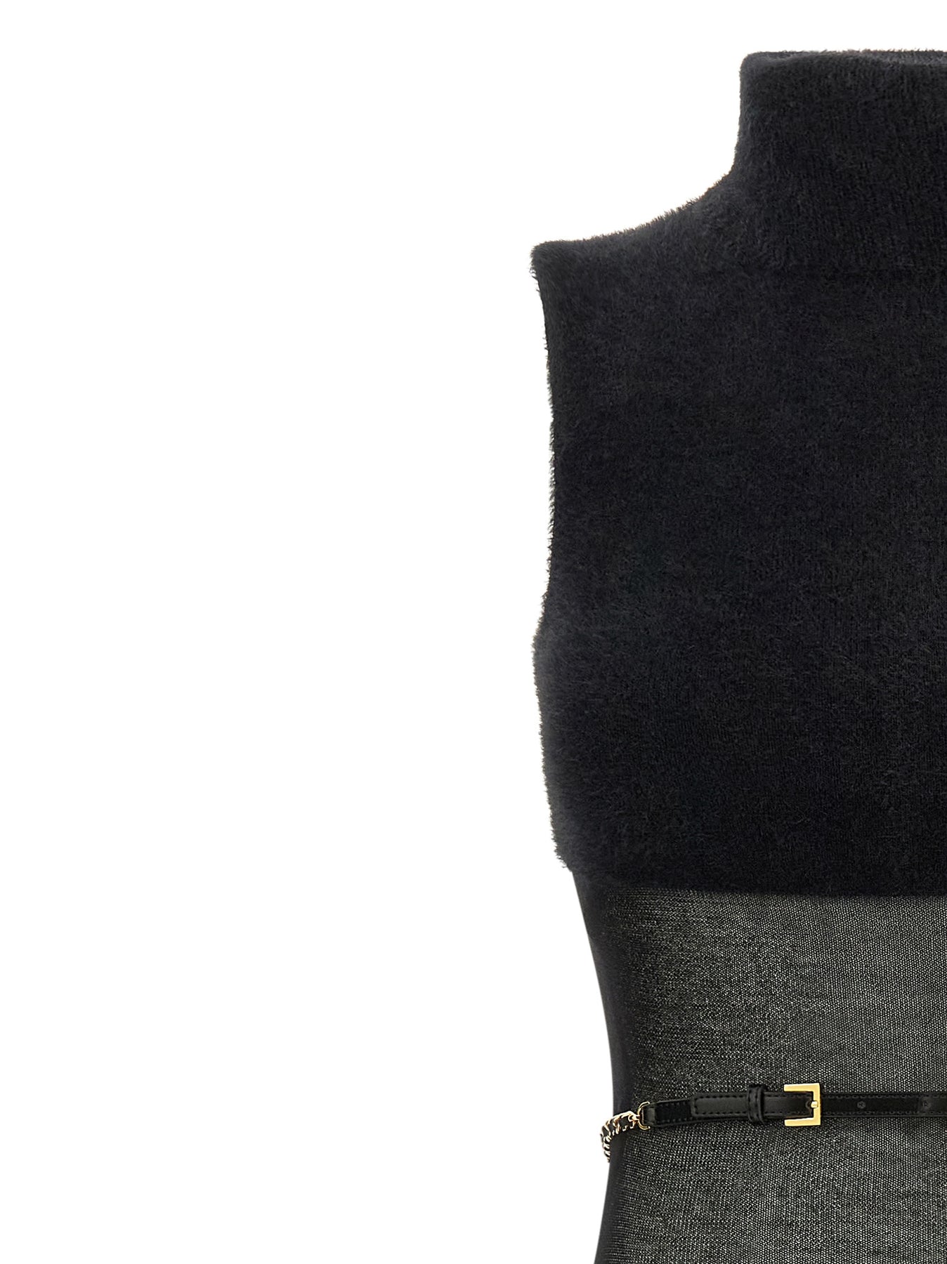 Fur-effect stretch knit midi dress with semi-transparent gauze insert at the waist, sleeveless turtleneck neck, longuette skirt, removable belt.