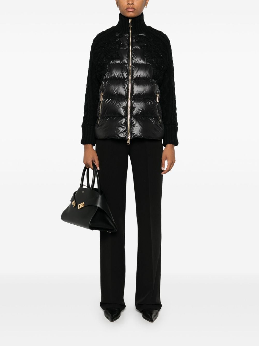 black stretch-design cady texture logo waistband two side inset pockets pressed crease full-length straight leg