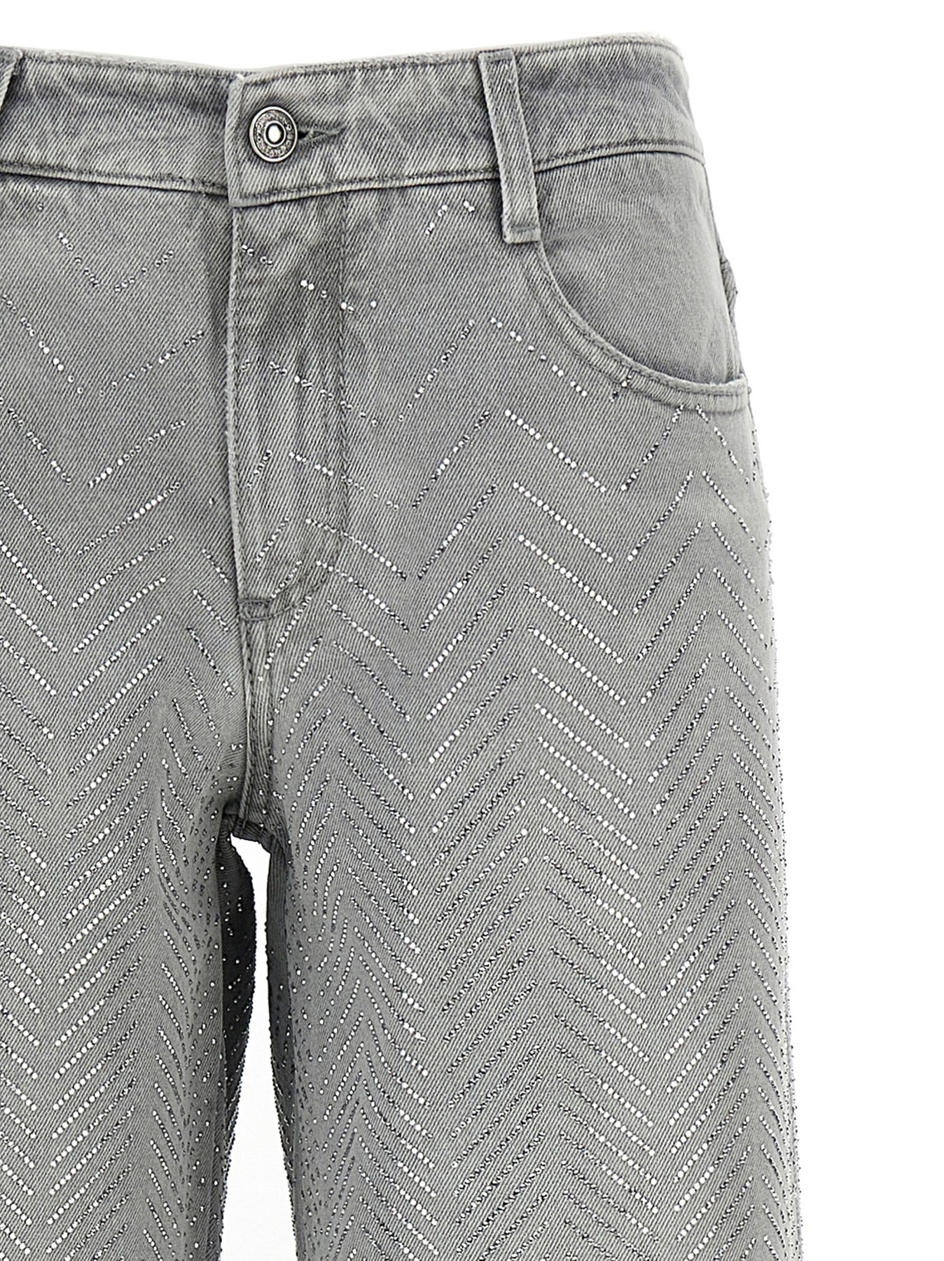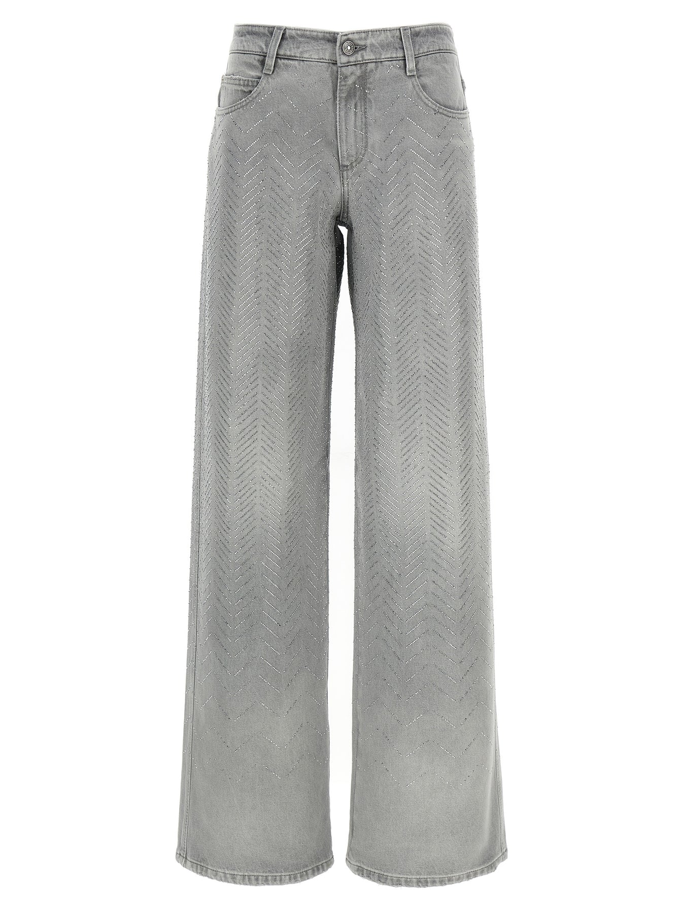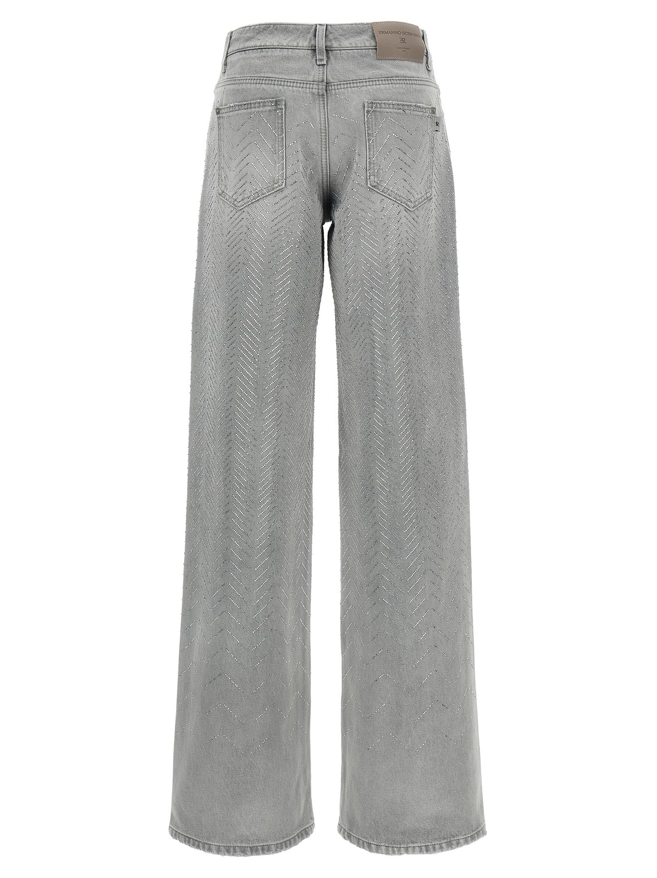 Used-effect garment-dyed cotton denim jeans with all-over rhinestone appliqué, five pockets, front zip and button closure, wide straight leg, back leather logo tag.