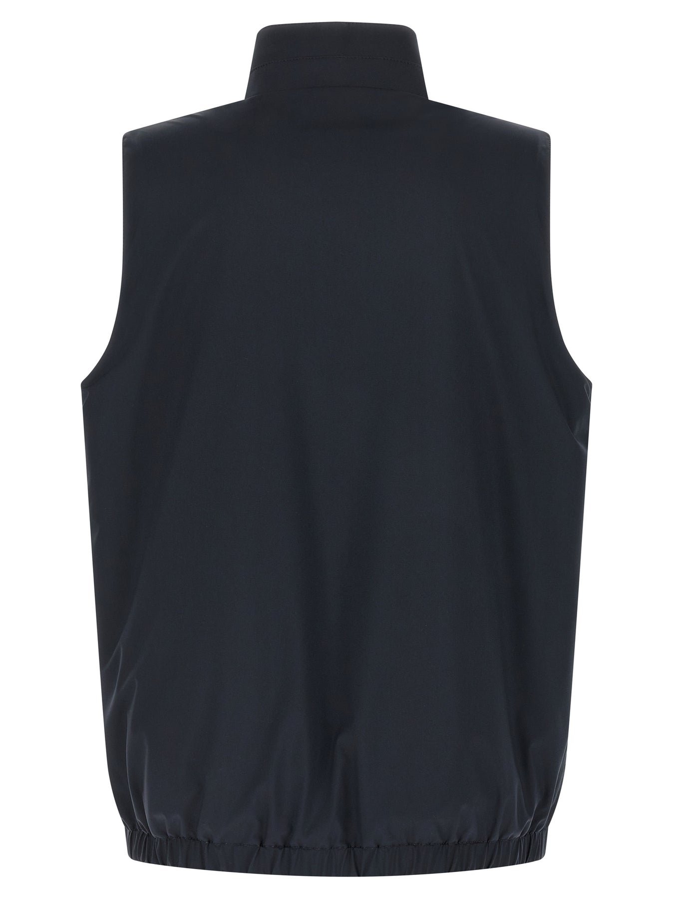 Double-sided vest in nylon and cotton jersey, high neck, front zip closure, enameled metal logo puller, side pockets, elastic hem.