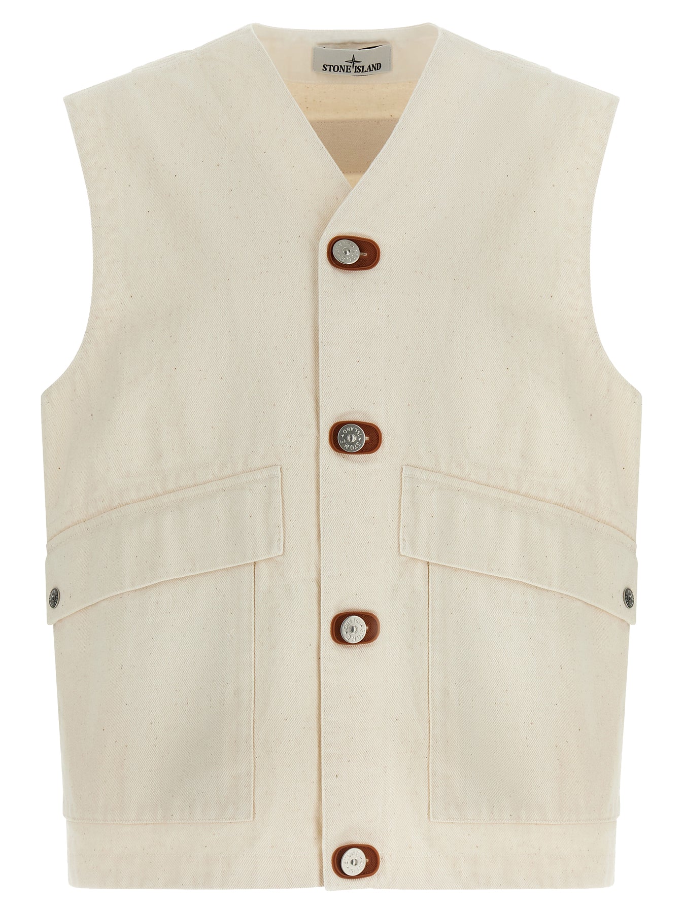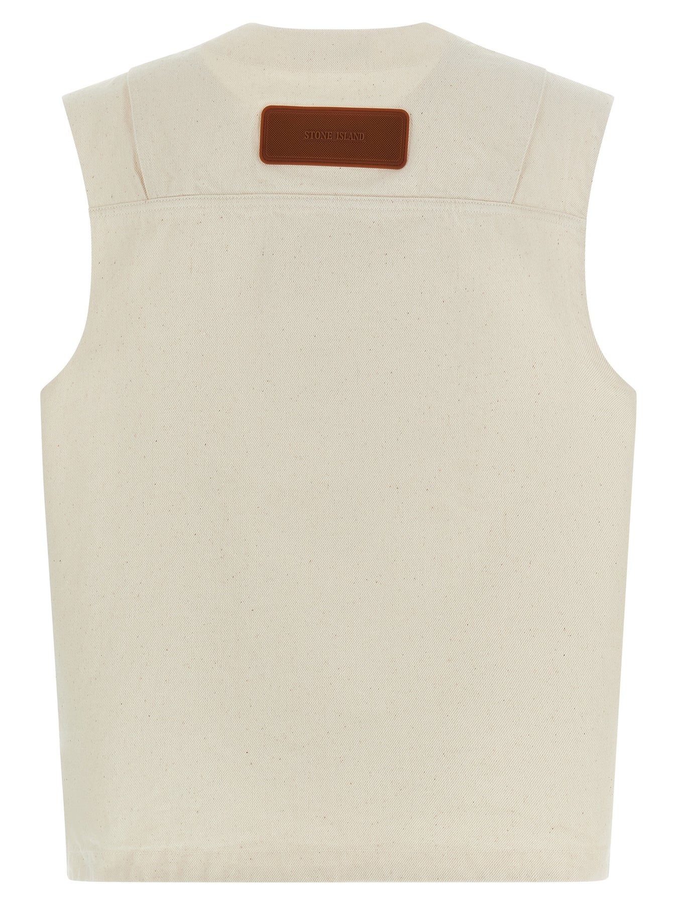 'G100012' vest in garment-washed cotton gabardine, V-neck, front button closure, pockets, back rubber logo patch. The unbleached fabric has some aesthetic impurities typical of raw cotton, which must be considered an integral and natural part of the material. SUSTAINABLE: This product is made with recycled cotton.