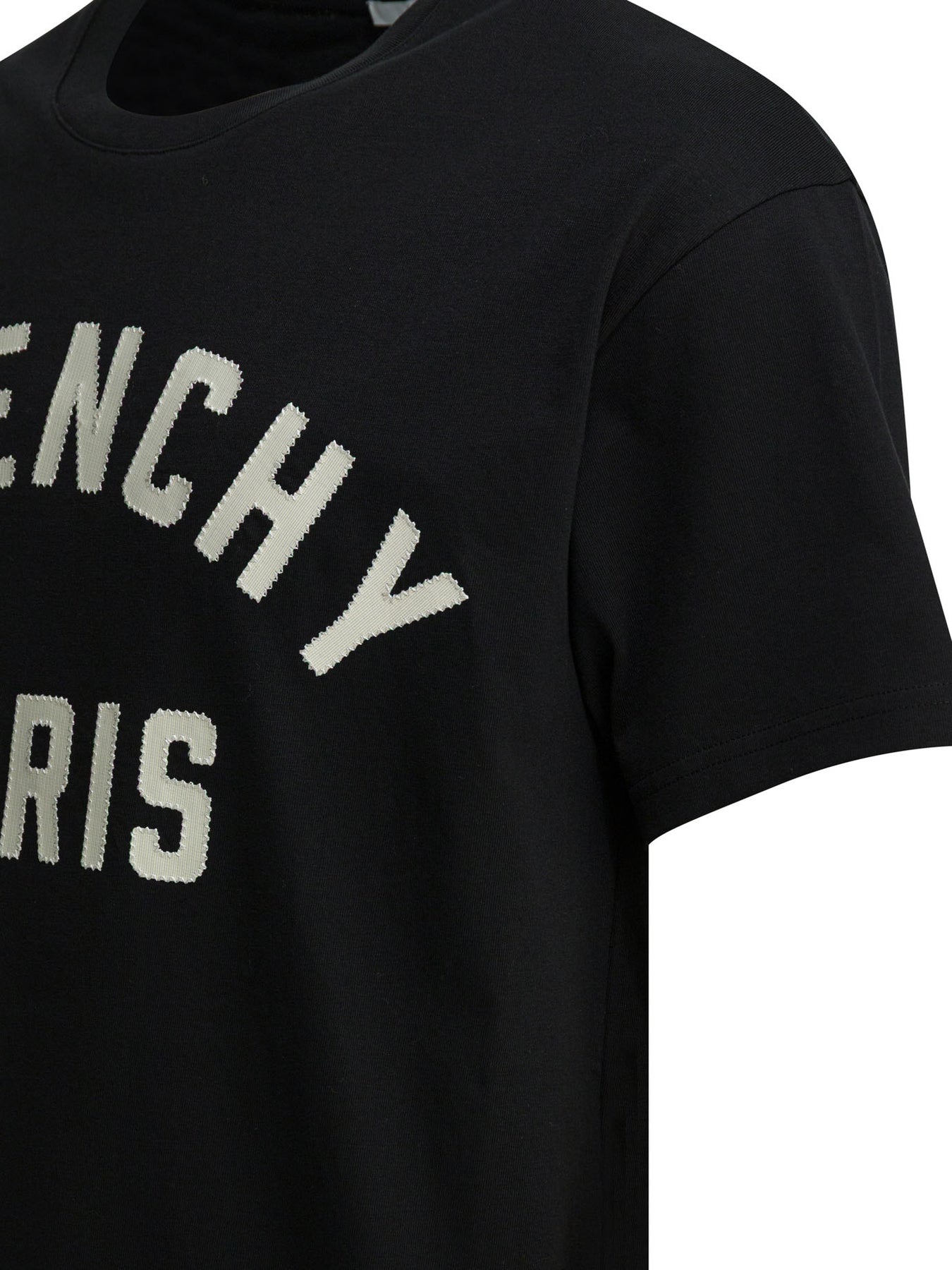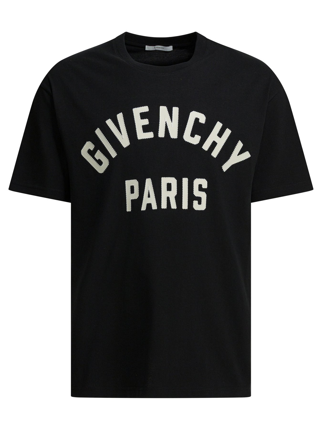 "Givenchy Paris" Givenchy T-shirt in cotton with a linear structure, constructed outerwear with short sleeves. The crew neck features a riveted workmanship, while the front houses the Givenchy Paris grosgrain appliqué, attached by embroidered zig-zag stitching, which defines a structural detail on the surface. The silhouette is regular, with no additional decorative elements, keeping the construction focused on material essentiality and workmanship of the inserts. || - Givenchy Paris logo applied in grosgrain on the front - Short sleeves - Crew neck with riveted finish - Embroidered zig-zag seams - Regular fit