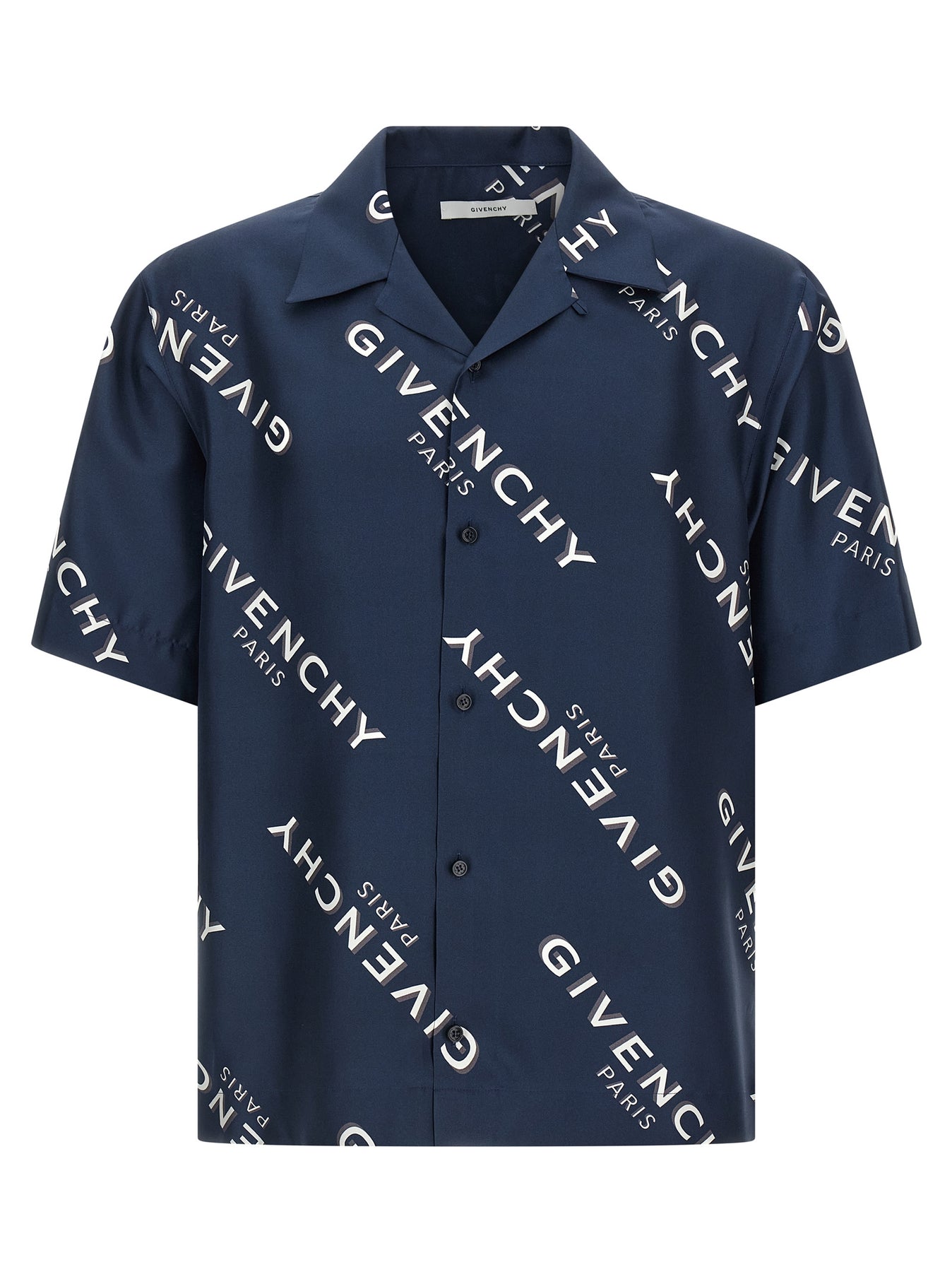 All-over 'GIVENCHY Shadow' print silk shirt with bowling style, Hawaiian collar, front button closure, short sleeves, side slits, and asymmetric hem.
