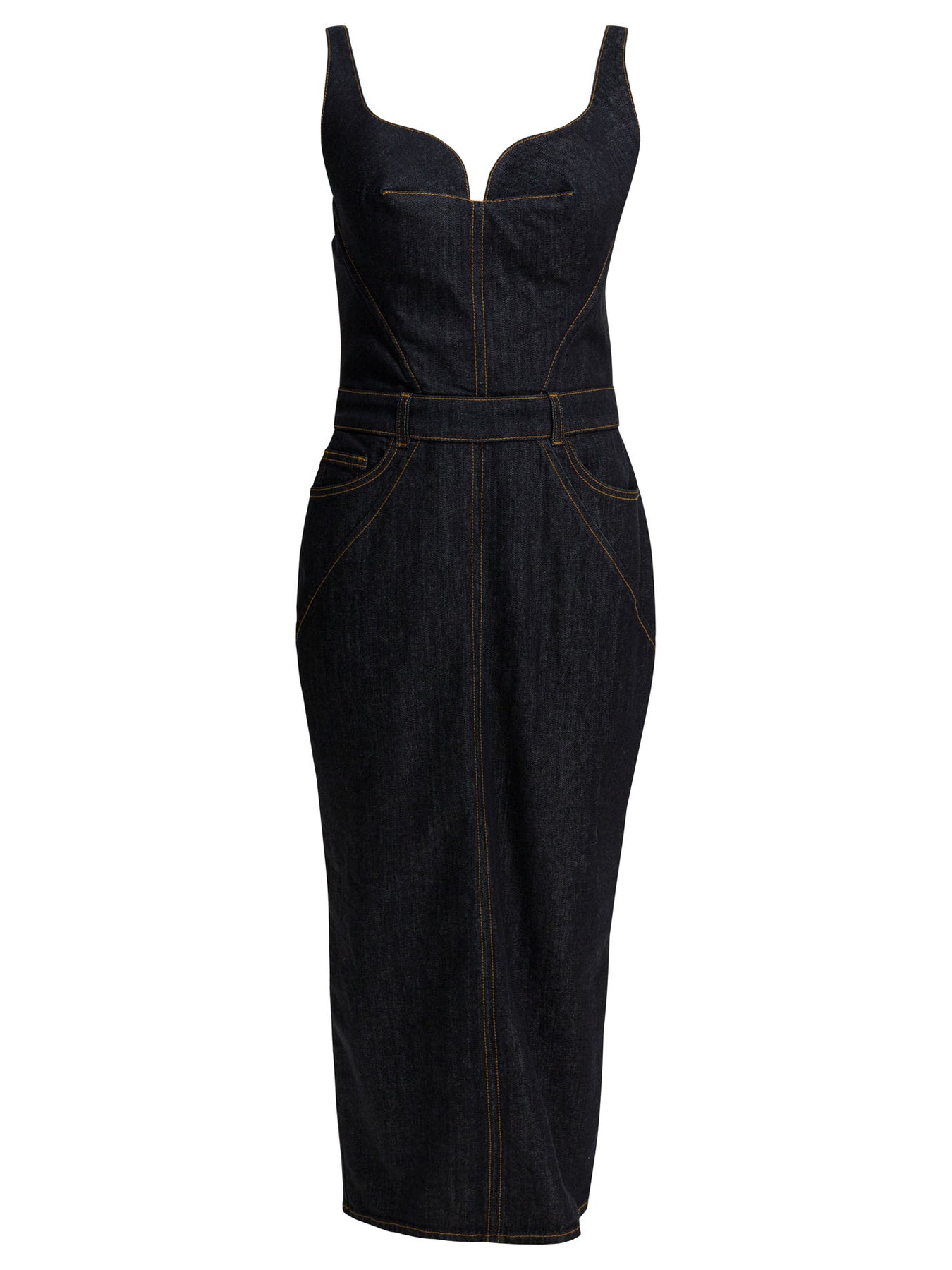 Givenchy raw denim sheath dress made of 98% cotton and 2% elastane fabric with a fitted midi structure and contrasting seams. The design features an integrated corset for a defined silhouette and a cinched waist completed with belt loops. A Givenchy logo leather label is attached at the back. Invisible back zipper closure. Three front pockets and two back pockets. Stretch details throughout. || - Solid color - Sheath dress - Sleeveless - Contrasting seams - Integrated corset - Belt loops at waist - Givenchy logo leather applique at the back - Invisible back zipper closure - Three front pockets - Two back pockets - Elasticized details - Regular fit