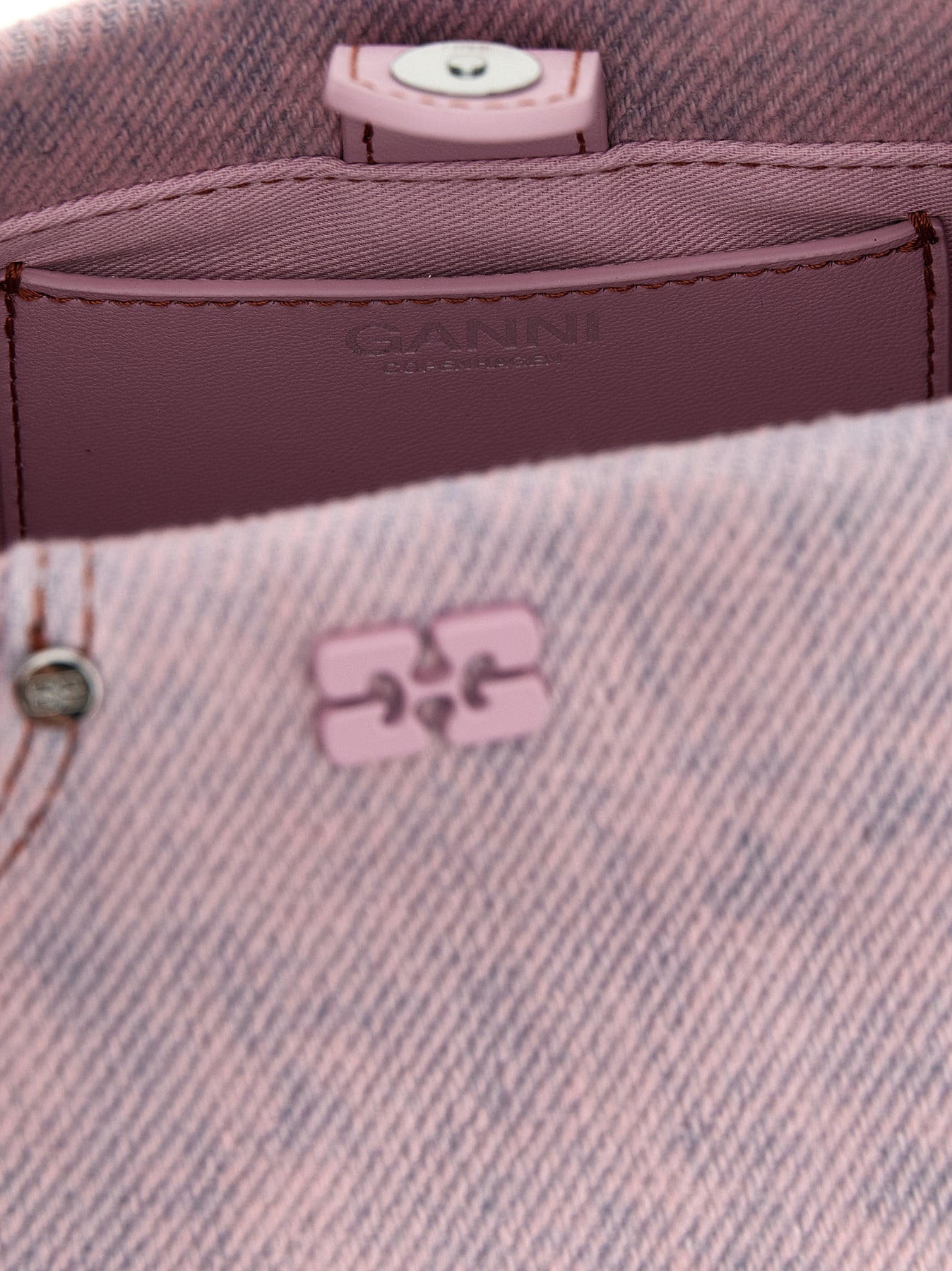 'Mini Bou' handbag in garment-dyed cotton denim with tone-on-tone metal 'GANNI Butterfly' logo on the front, back pocket with logo embroidery, fixed braided handle with knot and a metal nut, inner magnetic closure, adjustable and removable shoulder strap. SUSTAINABLE: Product made with recycled materials.