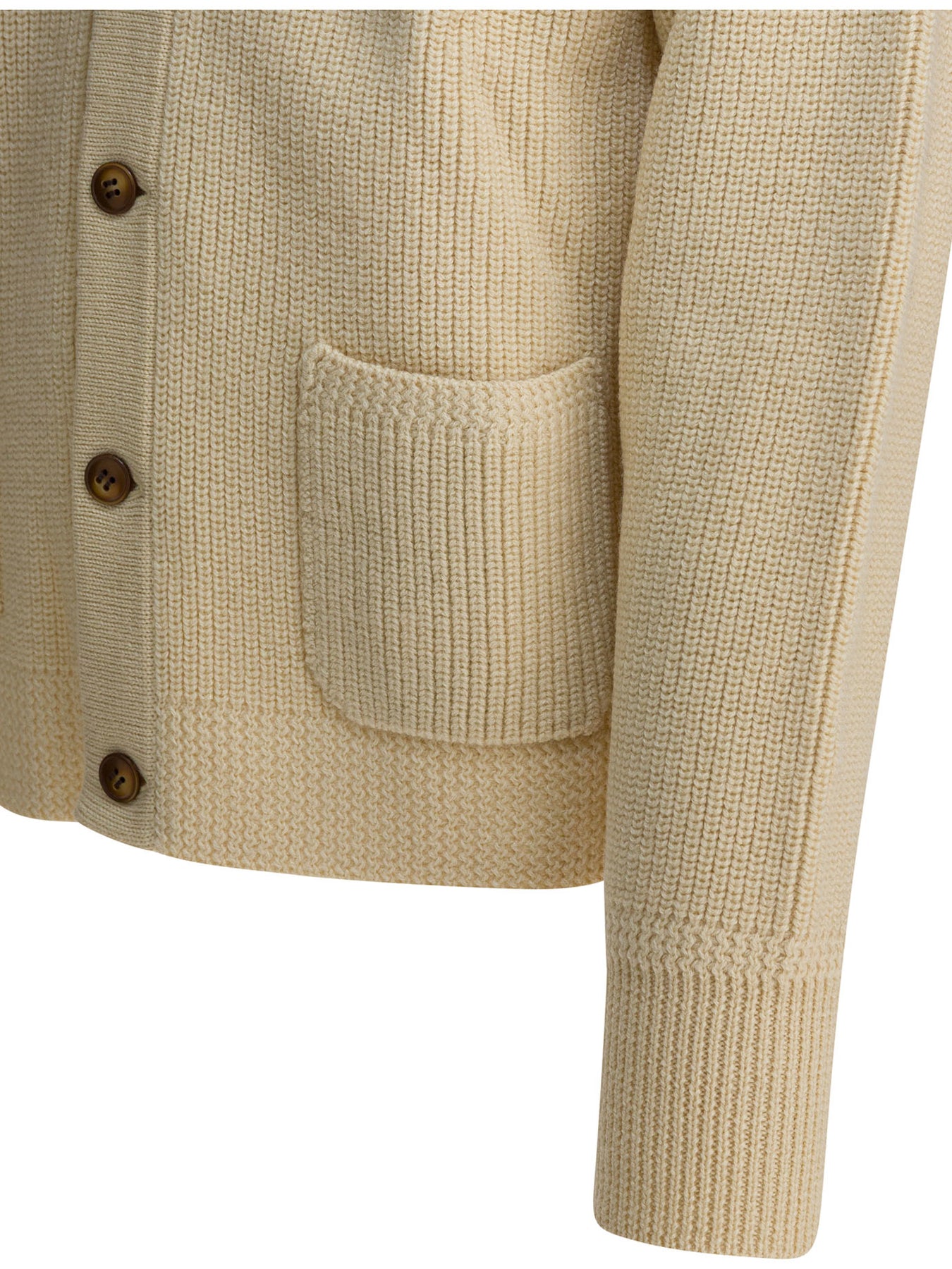 Human Made wool cardigan made of shaved knit with a soft texture. The garment features a compact construction with a removable collar applied by snap buttons. There are two patch pockets on the front and a heart-shaped patch sewn on the left chest. The sleeves are long and feature a wide line, completing a relaxed and regular silhouette. || - Heart-shaped logo applied on the chest - Long, wide sleeves - Removable collar with heart-shaped button closure - Two patch pockets on the front - Front button closure - Regular fit