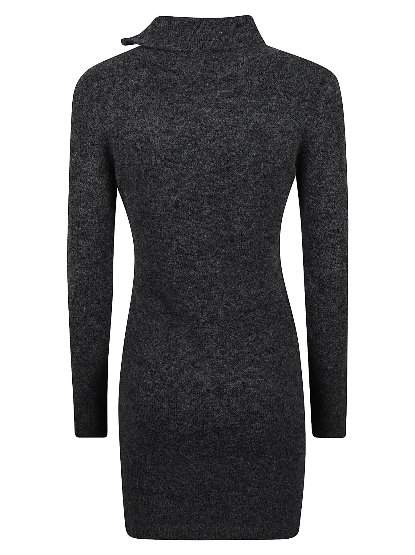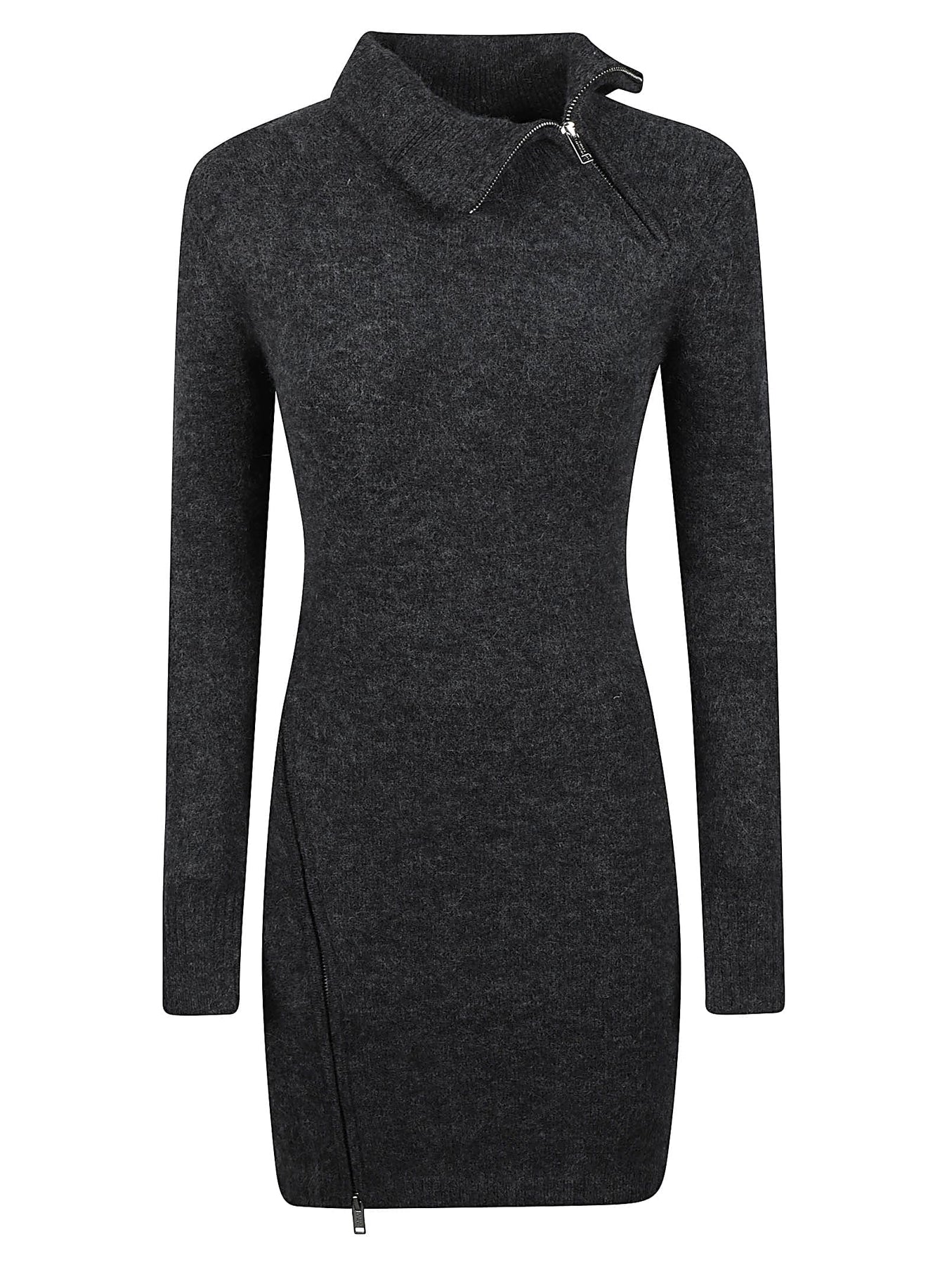 dark grey alpaca wool-blend stretch-design mélange effect knitted construction shoulder zip fastening long sleeves ribbed cuffs and hem side slit zip fastening straight hem