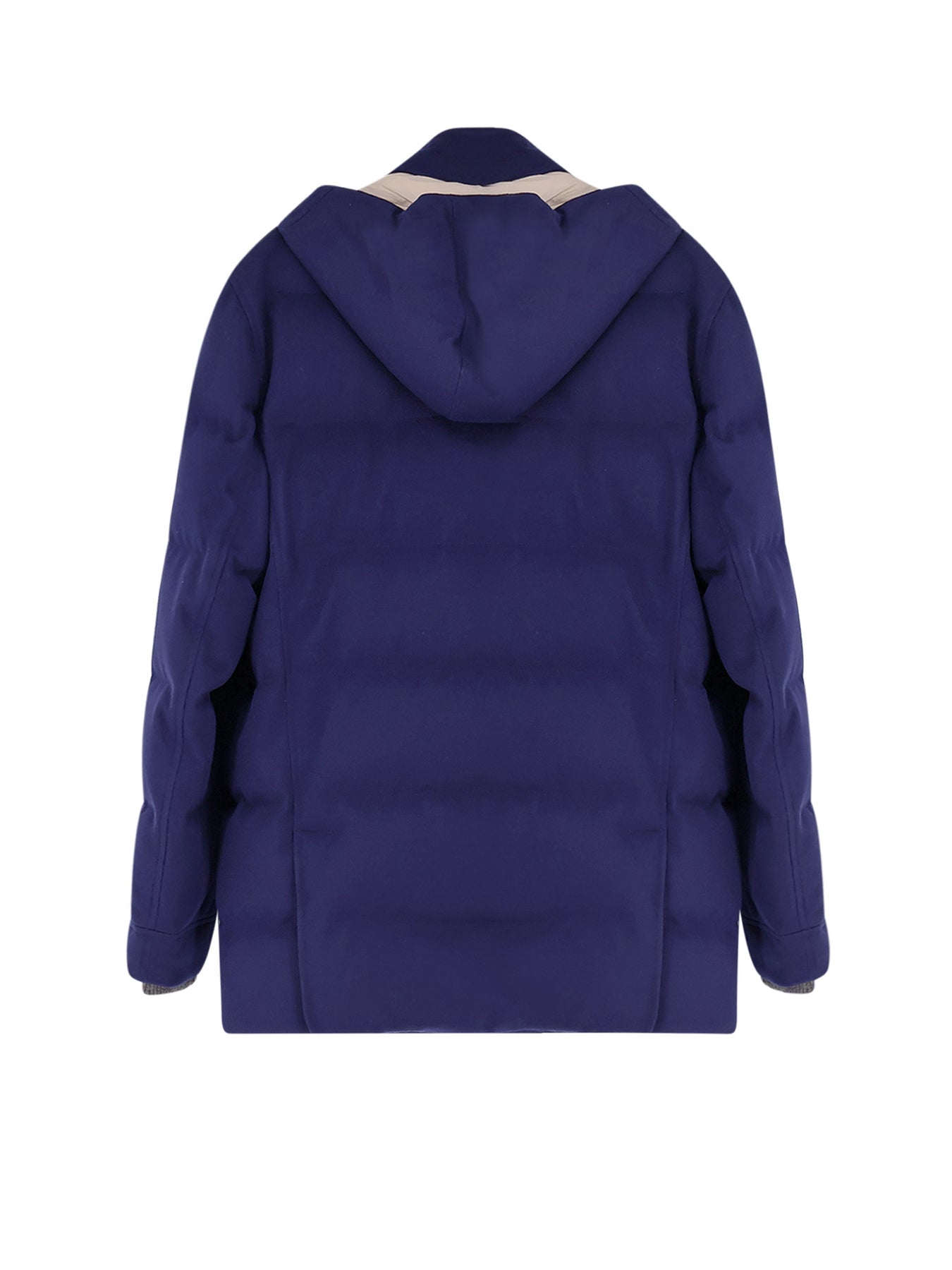 Zip closure, double slider, and snap buttons Removable hood Two front zip pockets Two front flap pockets with button Wool and cashmere details Made in Italy 100% wool Filling: 90% down, 10% feather SKU: MM4701823COU71