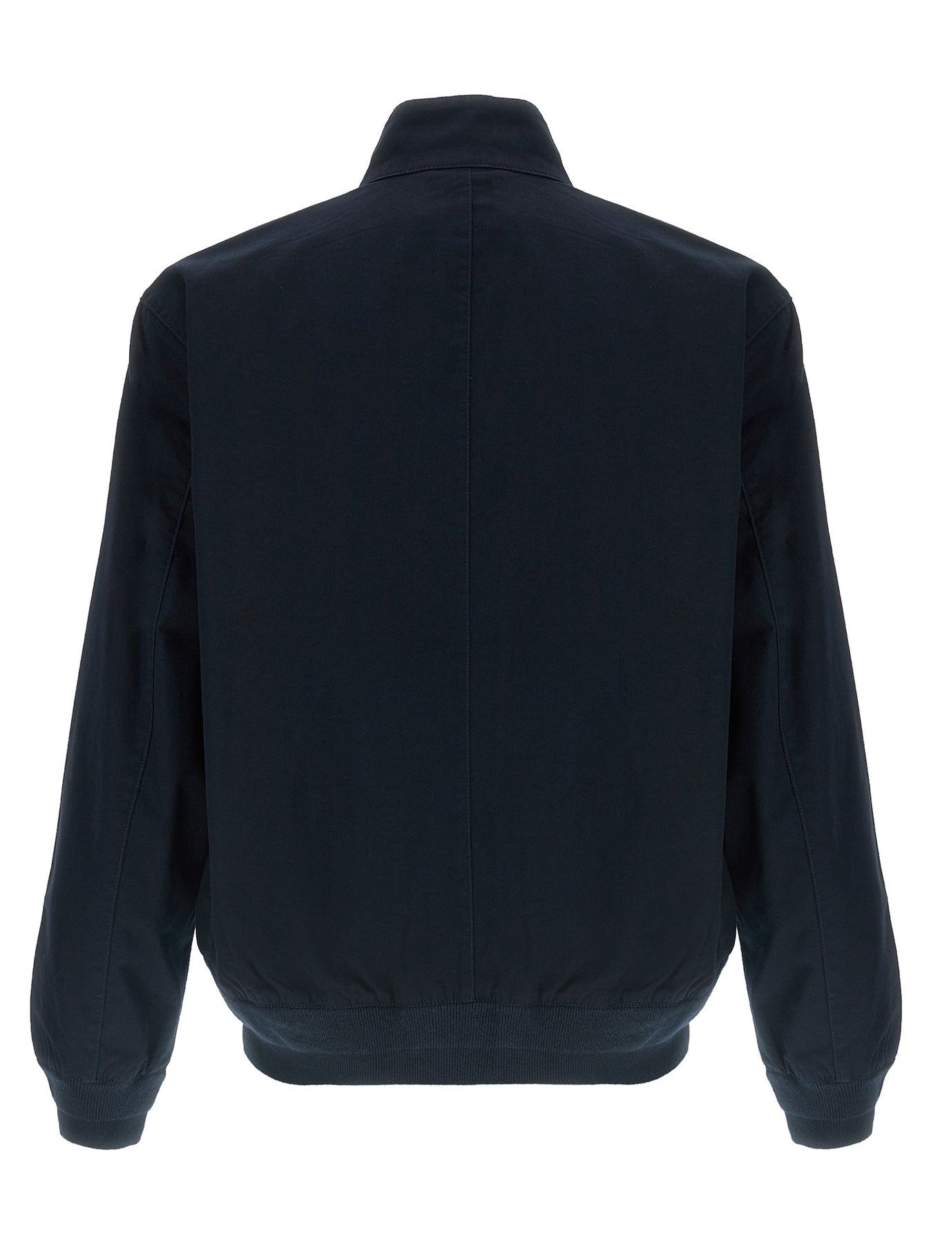 Cotton bomber jacket with front logo embroidery, zip closure, raised collar with buttons, pockets, long sleeves with knitted cuffs.