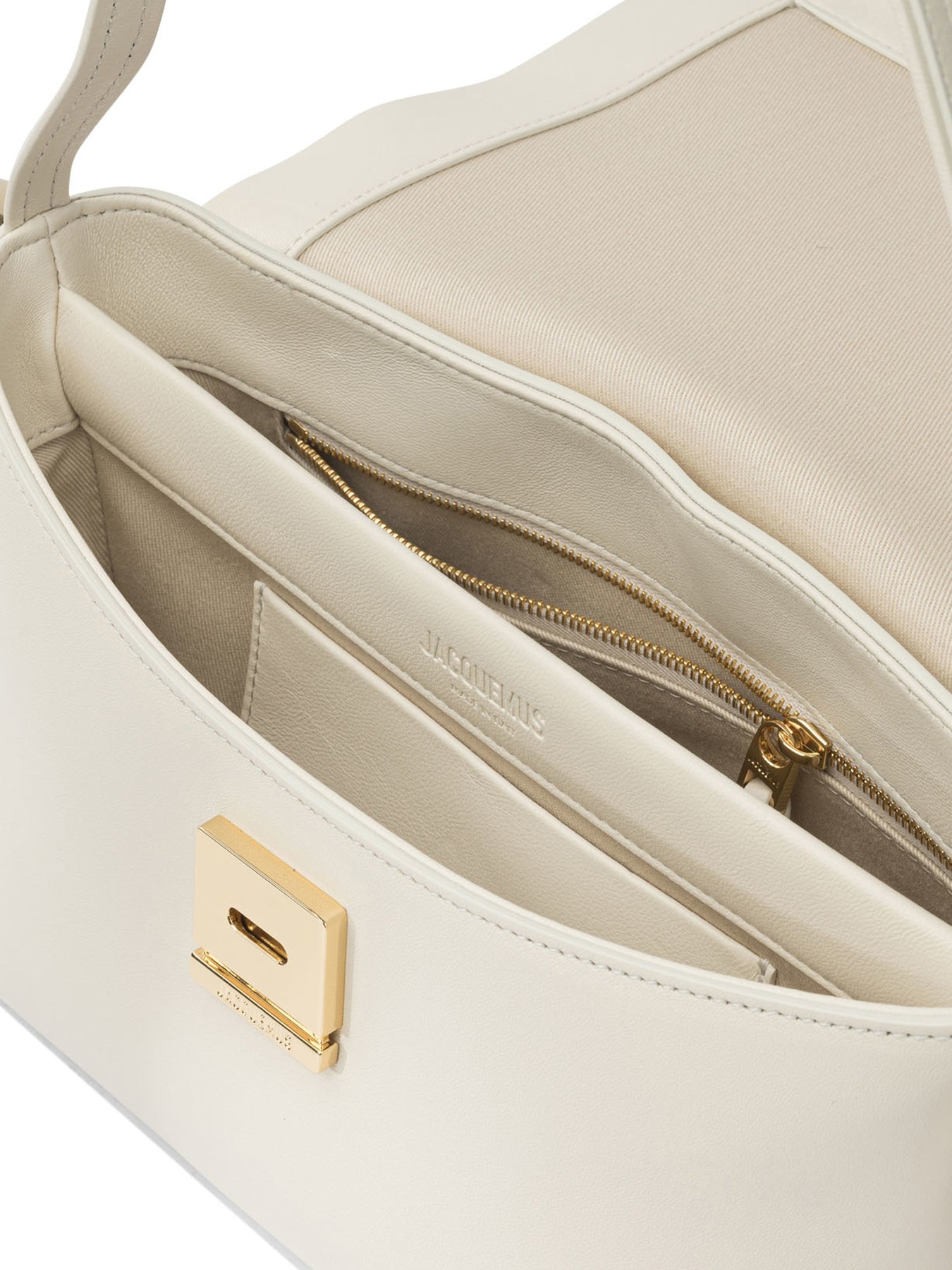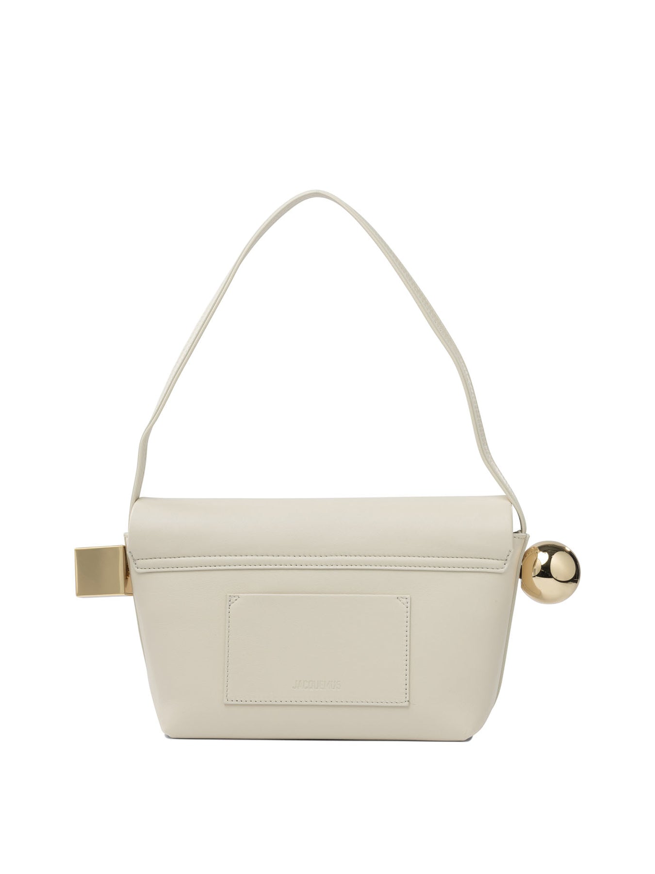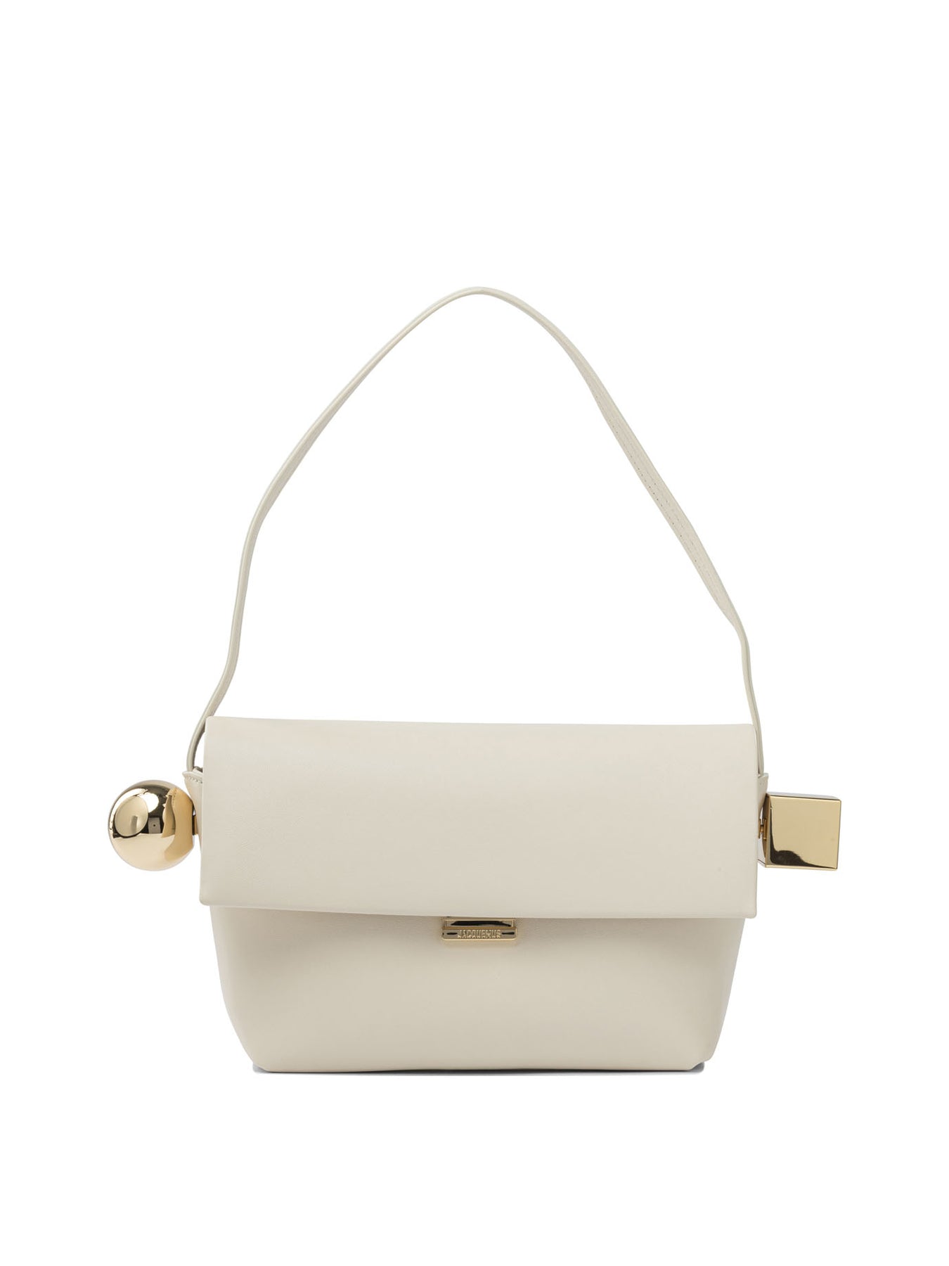 Jacquemus "Rond Carré" shoulder bag, made of soft nappa leather with a compact rigid structure and essential silhouette. The design incorporates a top handle and a fold-over flap with magnetic closure. The main body incorporates smooth metal inserts secured with gold-plated hardware, while the Jacquemus logo is applied in metal on the front. All interior surfaces are lined with cotton. || - Fine-grained nappa leather with a smooth surface - Textured top handle - Flap with fold-over magnetic closure - Gold-plated ball and cube charm - Back patch pocket - Interior patch pocket - Inside zipper pocket - Gold-plated metal trim and logo - Inside cotton lining - Handle width designed for shoulder use