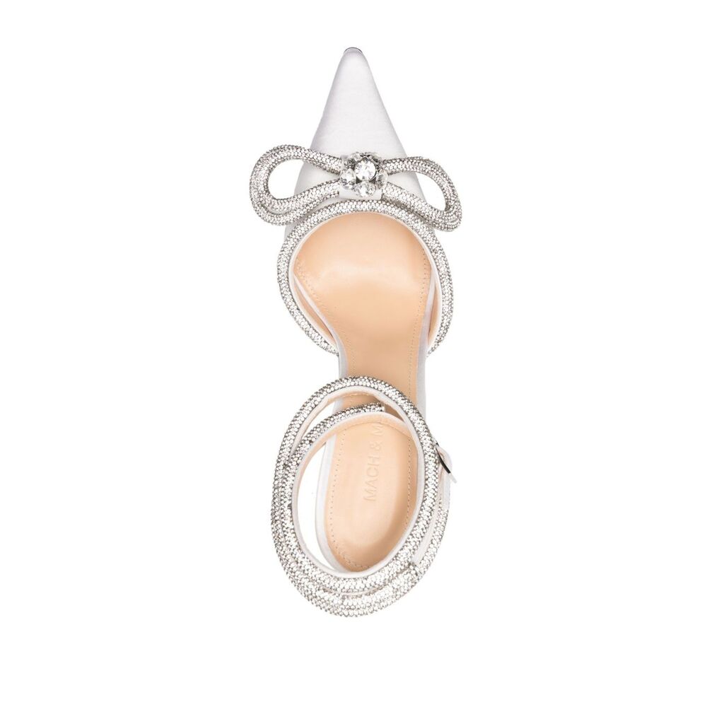 white calf leather/silk satin pointed toe bow detailing crystal embellishment buckle-fastening ankle strap branded leather insole high stiletto heel