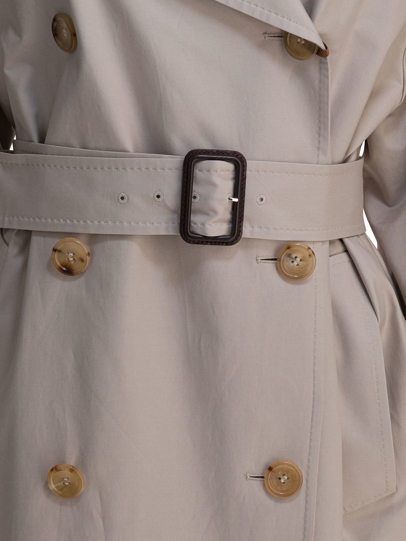 Max Mara The Cube cotton twill double-breasted trench coat with straight line and semi-lined construction. Main fabric composed of at least 50 percent organically grown cotton, processed with non-drip finish. Large lapel collar, raglan sleeves and wide back slit. Horn button closure, matching fabric belt, welt pockets on hips, frogs on cuffs and shoulders. || - Solid color - Long sleeves. - Cotton twill fabric, at least 50% organic cotton - Drip-proof finish - Double-breasted closure with horn buttons - Matching belt - Side welt pockets - Wide lapel collar - Raglan sleeves - Wide back slit - Toggles on cuffs and shoulders - Semi-lined - Eco-friendly product - Regular fit