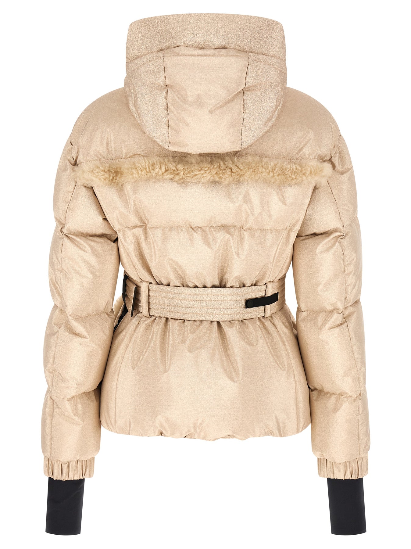 'Mondim' ski jacket made of quilted water-repellent metallized fabric with tone-on-tone long-haired sheepskin inserts, goose down padded polyester lining, adjustable hood, high neck, YKK® AquaGuard® Highly Water Resistant zip closure and front snap buttons, pockets, long sleeves with windproof gaiter and applied logo patch, elastic back waistband, inner gaiter on the hem. Removable belt with glove hook detail.