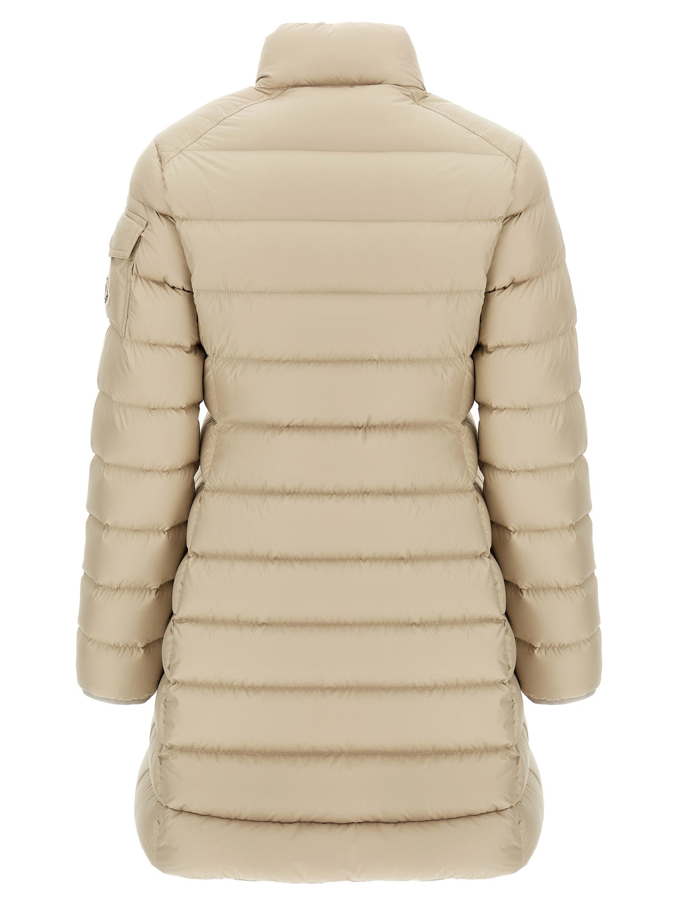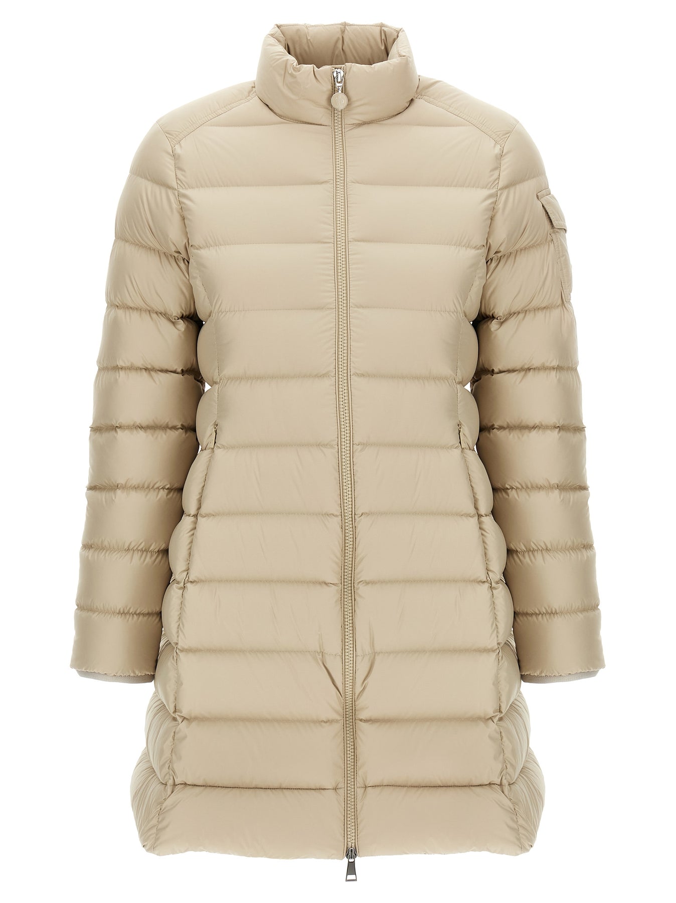 Microfiber 'Igesse' down jacket with boudin quilted matte finish and goose down padding, flared silhouette, standing collar, front zip closure, pockets, long cuffed sleeves and felt logo patch appliqué.