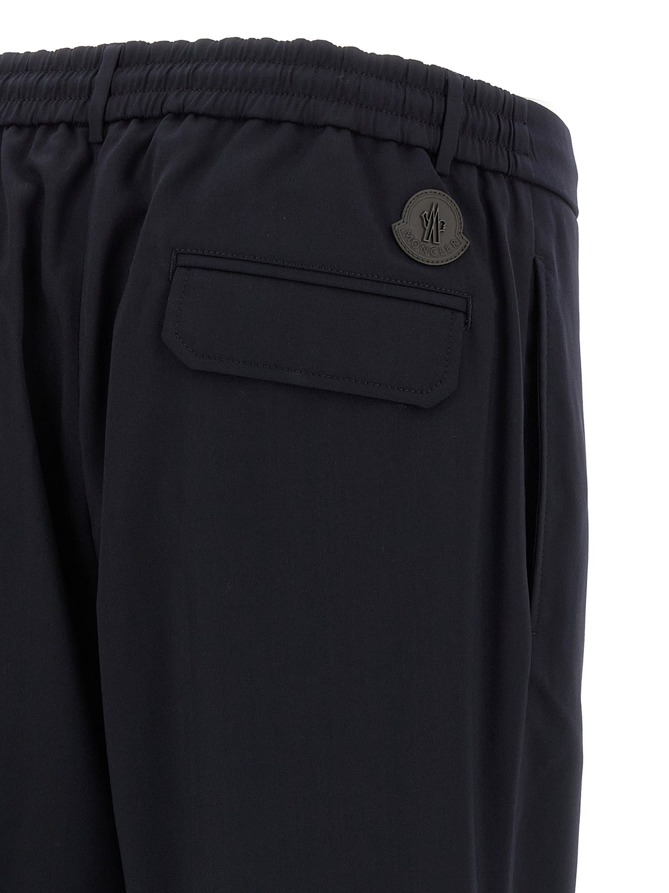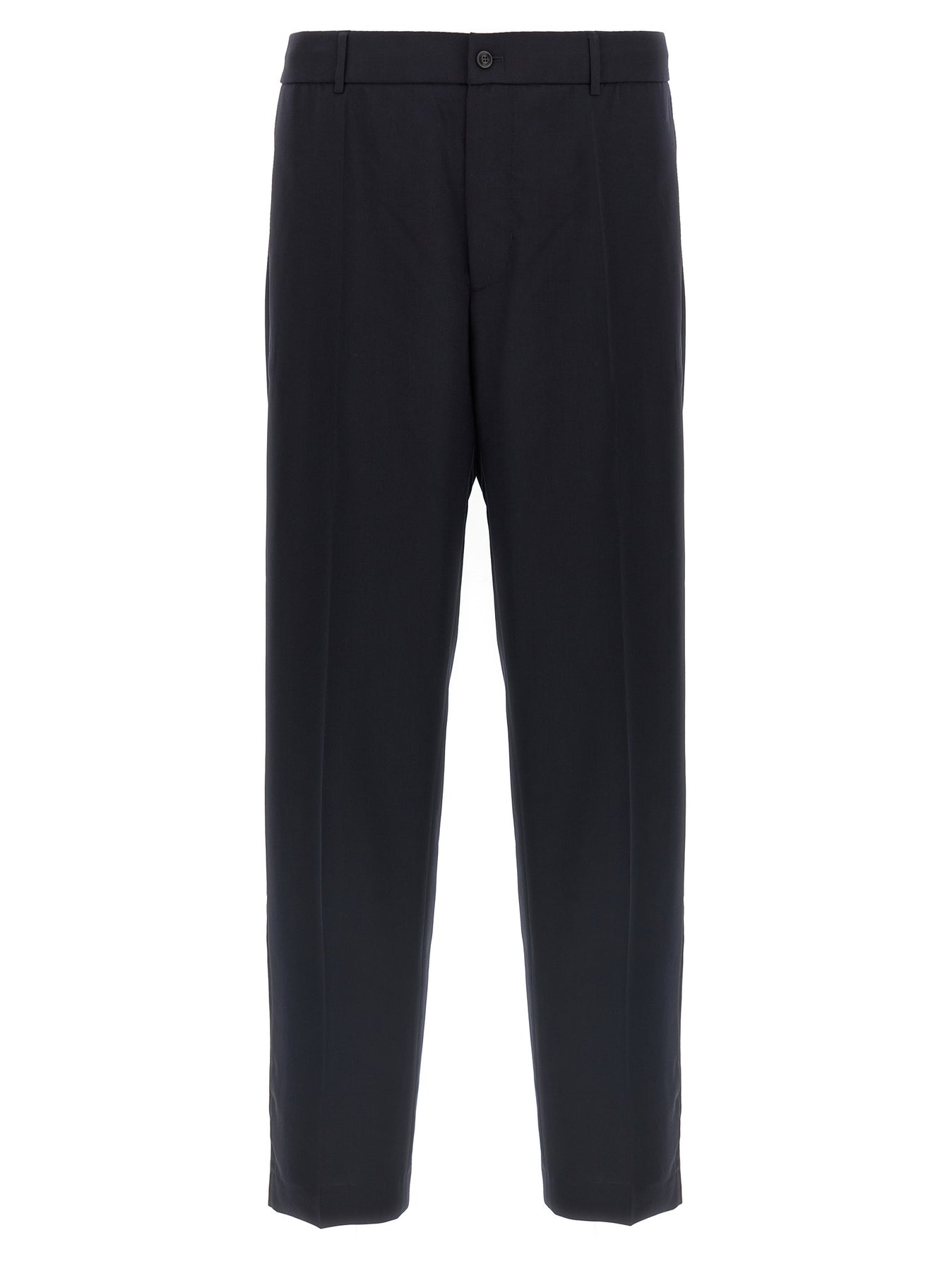 Wool blend gabardine pants, back leather logo patch, adjustable drawstring elastic at the waist, front zip and button closure, pockets, stretched pleat, straight leg.