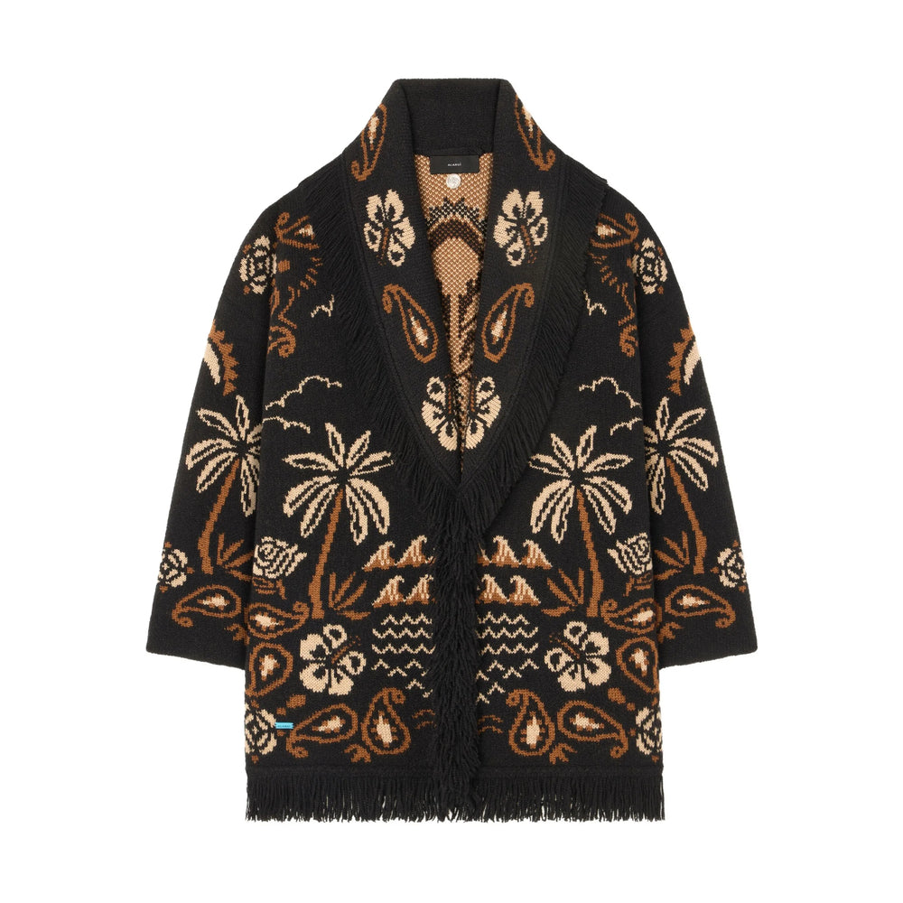 dark brown jacquard knit scarf motif lapel collar belt fringed edges