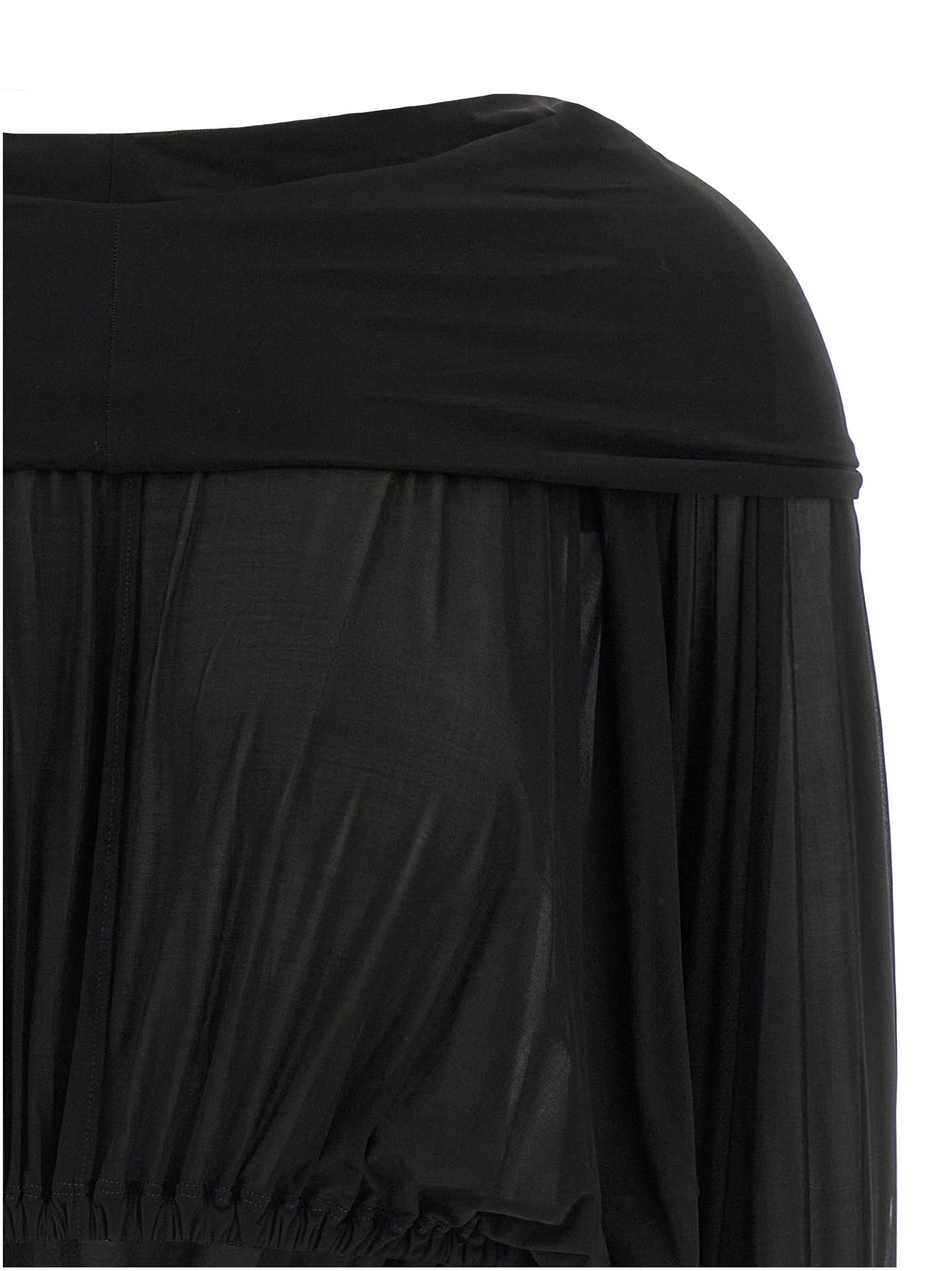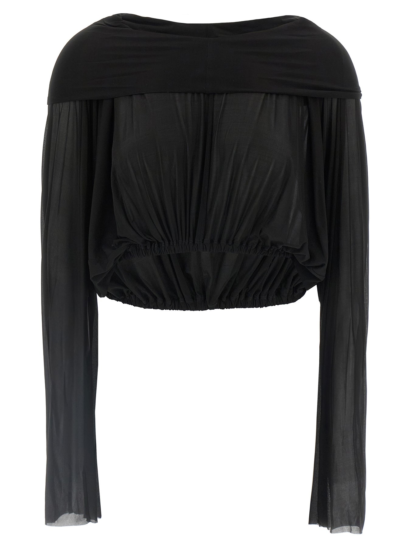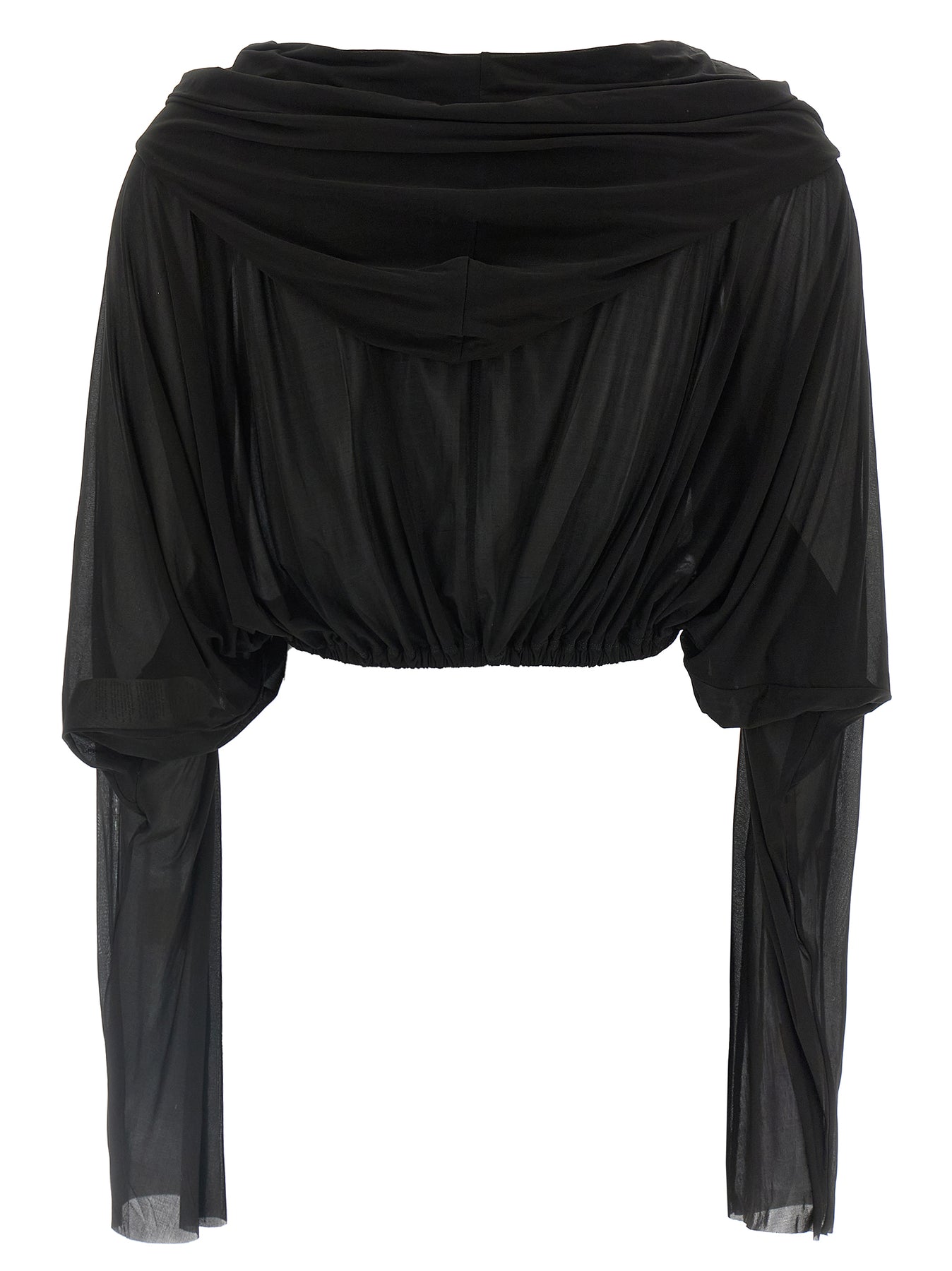 'Crooped Hooded Tunic' semi-transparent cupro sweater, hood, crop model, shawl collar, elastic hem, long bat sleeves with raw cut hem.
