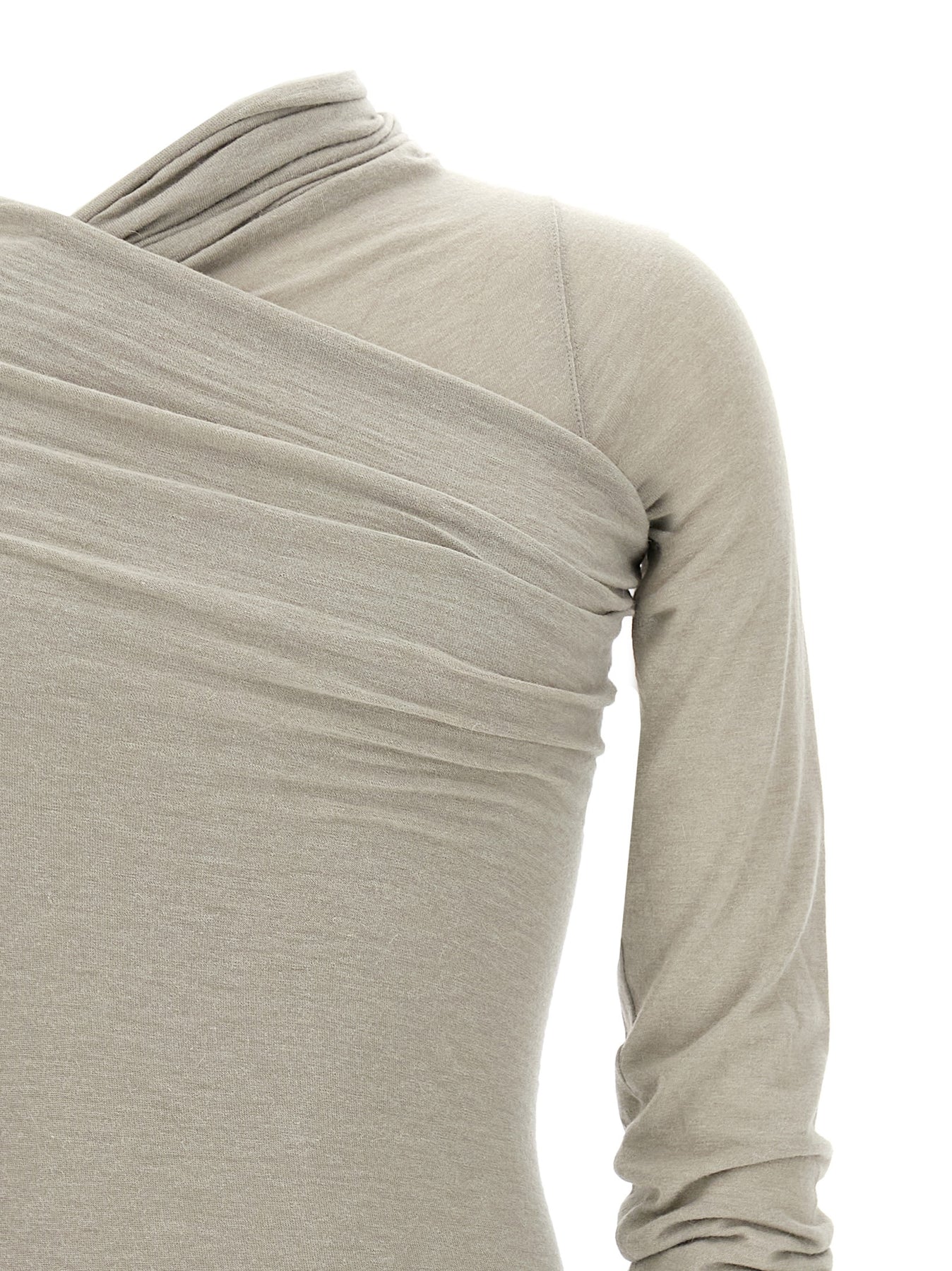 'Hollywood Banana' long-sleeved T-shirt in wool, angora and viscose blend. It has a bottom layer with two round holes with ribbed edges and an outer layer that folds to create a crossed draping on the front and back neck.