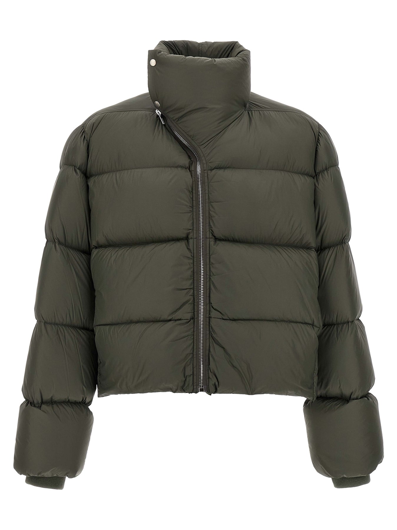 Long 'Turtle' quilted nylon down jacket with goose down padding, standing collar, asymmetrical front zip closure, pockets, long sleeves with stretch knit cuffs, cotton strap with rivets on the back rack.