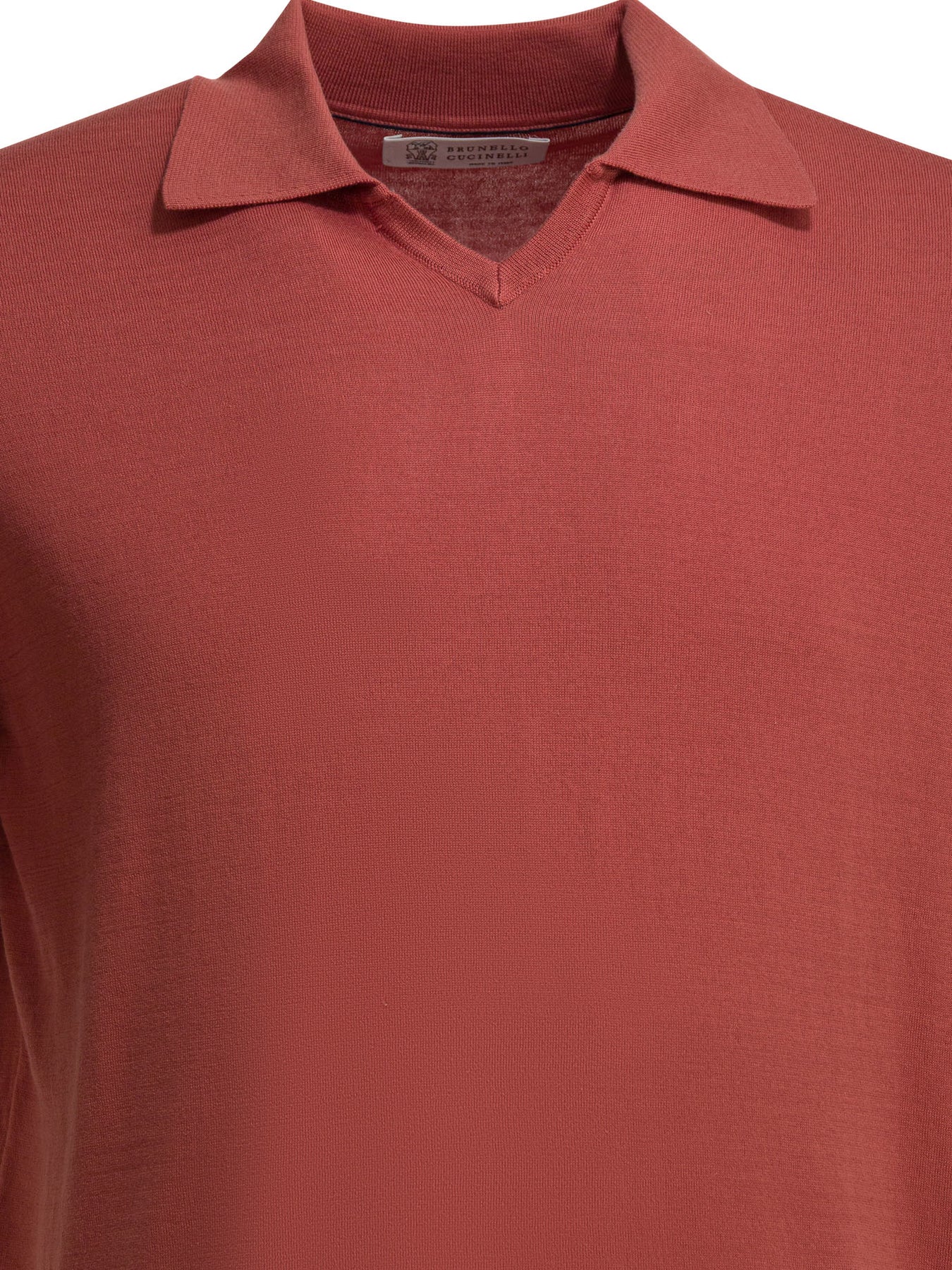 Brunello Cucinelli cotton buttonless polo shirt made of shaved knit with a compact structure. Ribbed finished polo collar and sleeve bottoms. Contrasting edges on the cuffs define the short sleeve structure. Regular fit maintains a classic silhouette. The absence of buttoning emphasizes the clean lines of the garment. All elements are assembled with flatlock seams to minimize thickness. || - Solid color - Short sleeves - Ribbed polo collar - Contrasting edges on cuffs - Ribbed sleeve bottoms - Shaved knit - Regular fit