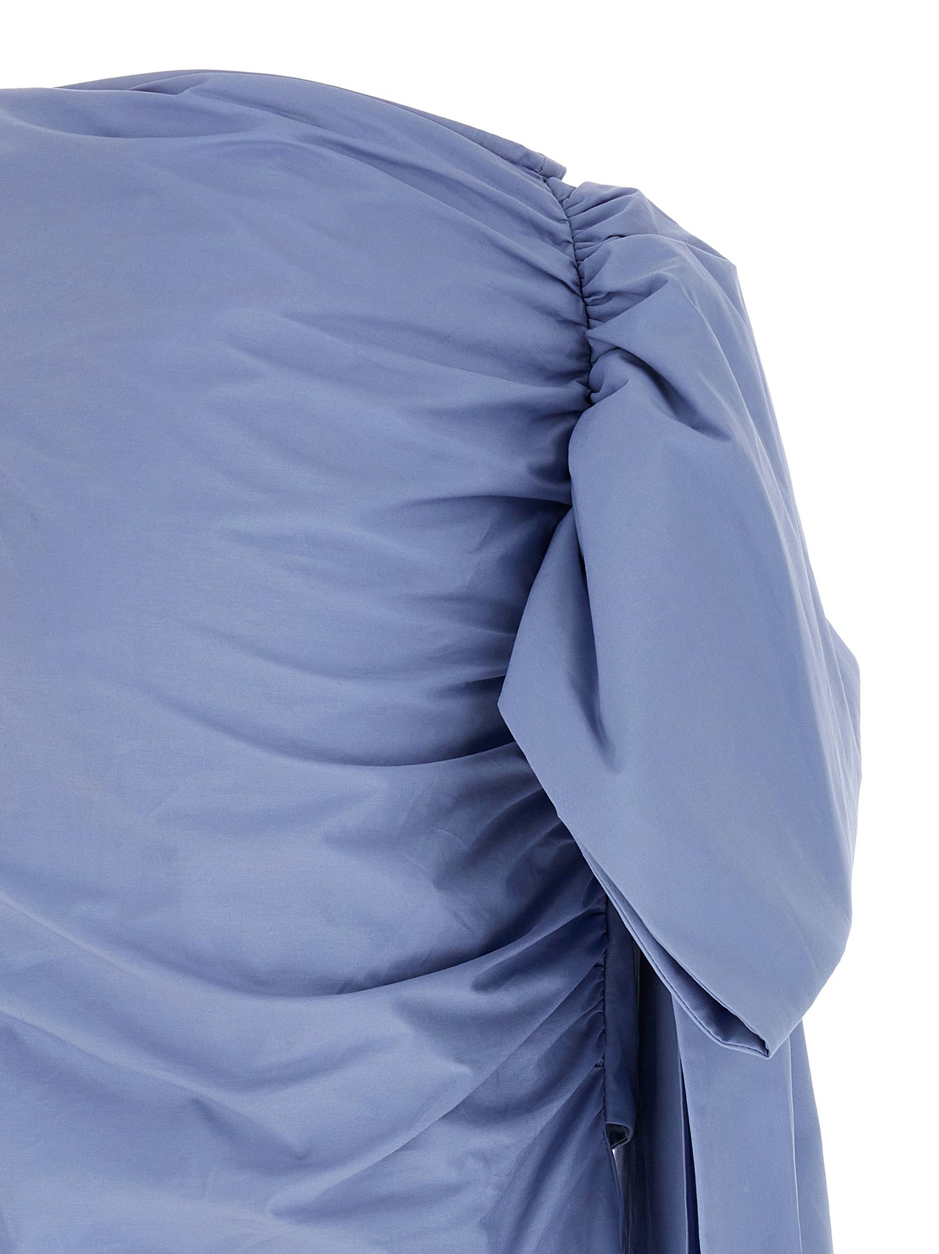 'Blue Cotton Tie Side Mini' cotton skirt with curled front and back, maxi bow detail, asymmetrical hem, side zip closure.