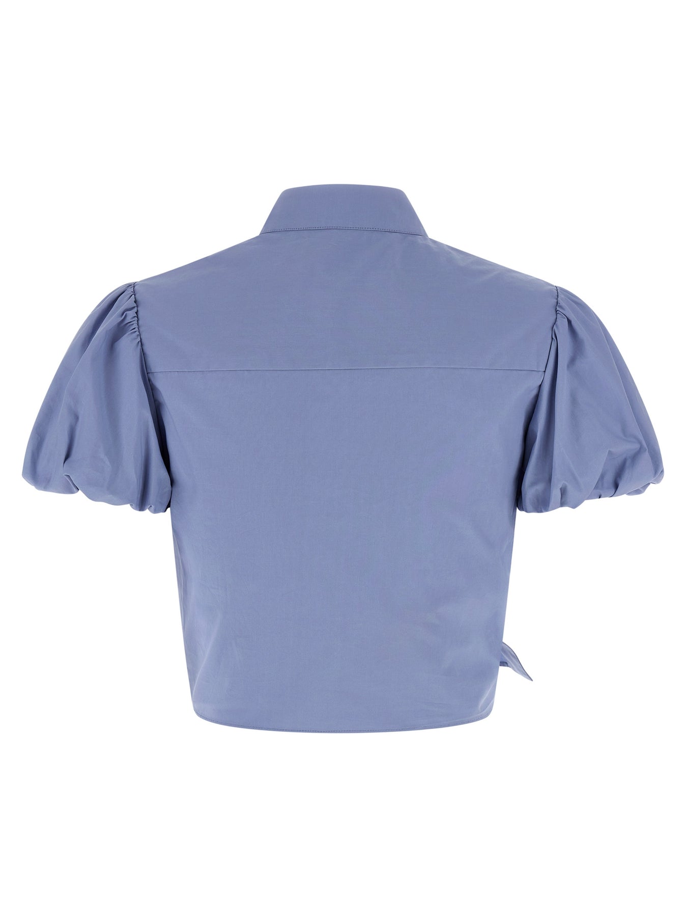 'Blue Cotton Tie Side' crop top in cotton with front asymmetric snap button closure with knot on the hem, high neck, breast pocket, removable corsage brooch, and short balloon sleeves.