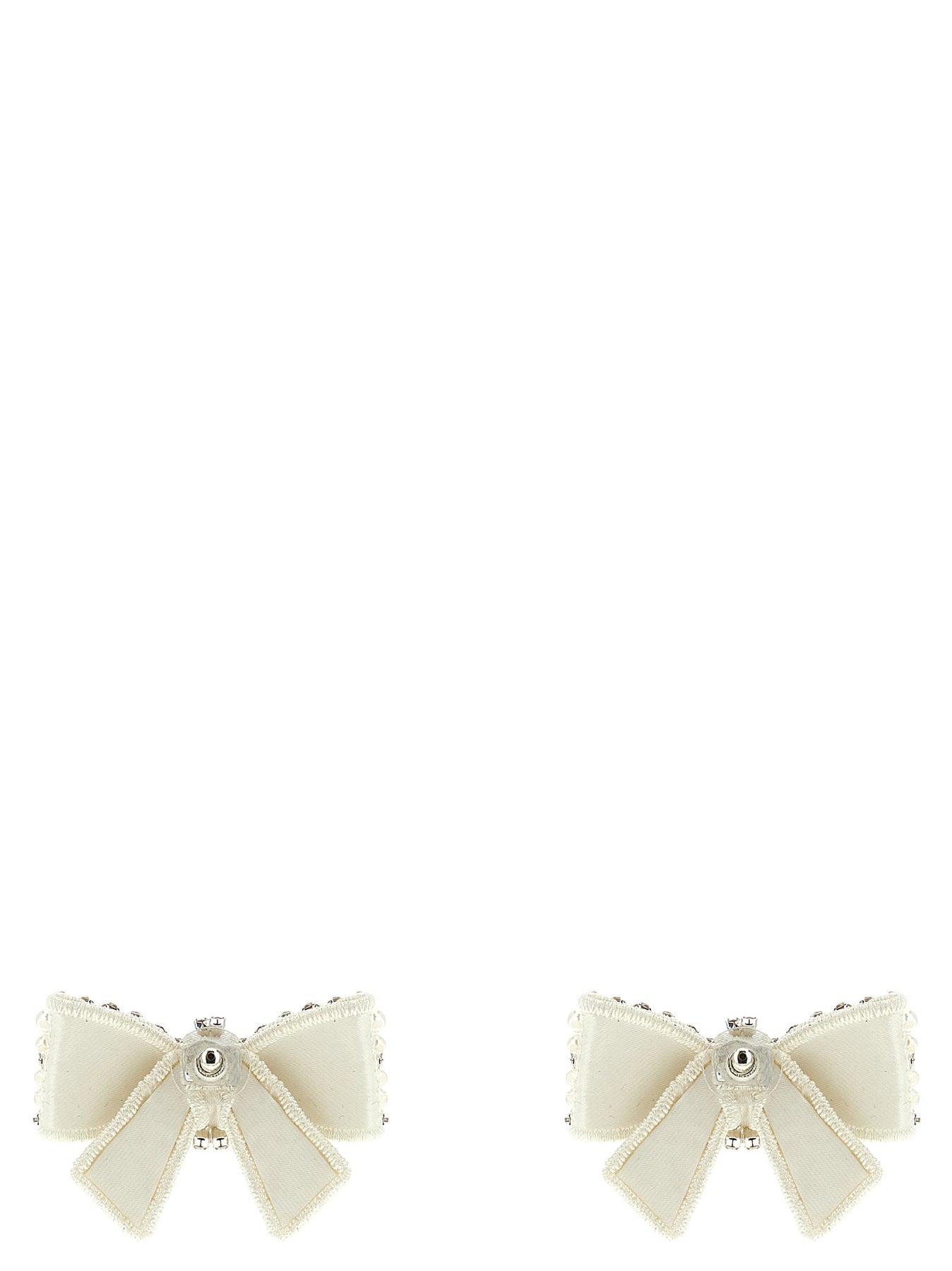 'Pearl Satin Bow' earrings in satin coupled with application of crystals and all-over pearls, bow shape, button closure. ITEM CANNOT BE RETURNED