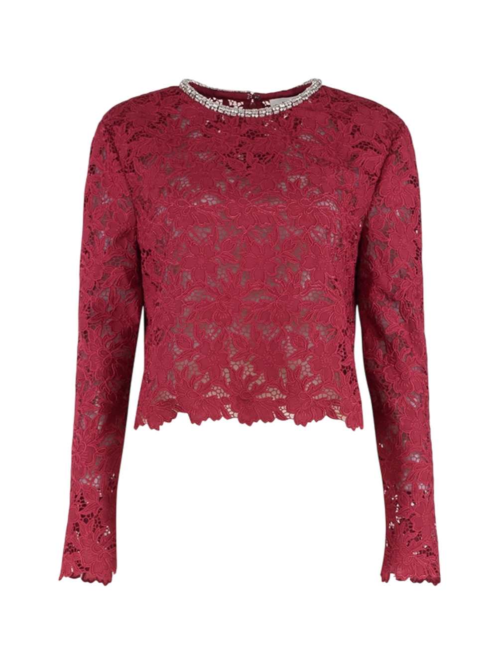 Crystal Top Features Burgundy Lace Crystals Crewneck Long sleeves Scalloped hem Composition 100% polyester, 100% polyamide Washing Instructions Read the manufacturer`s instructions ID RS26171TBU