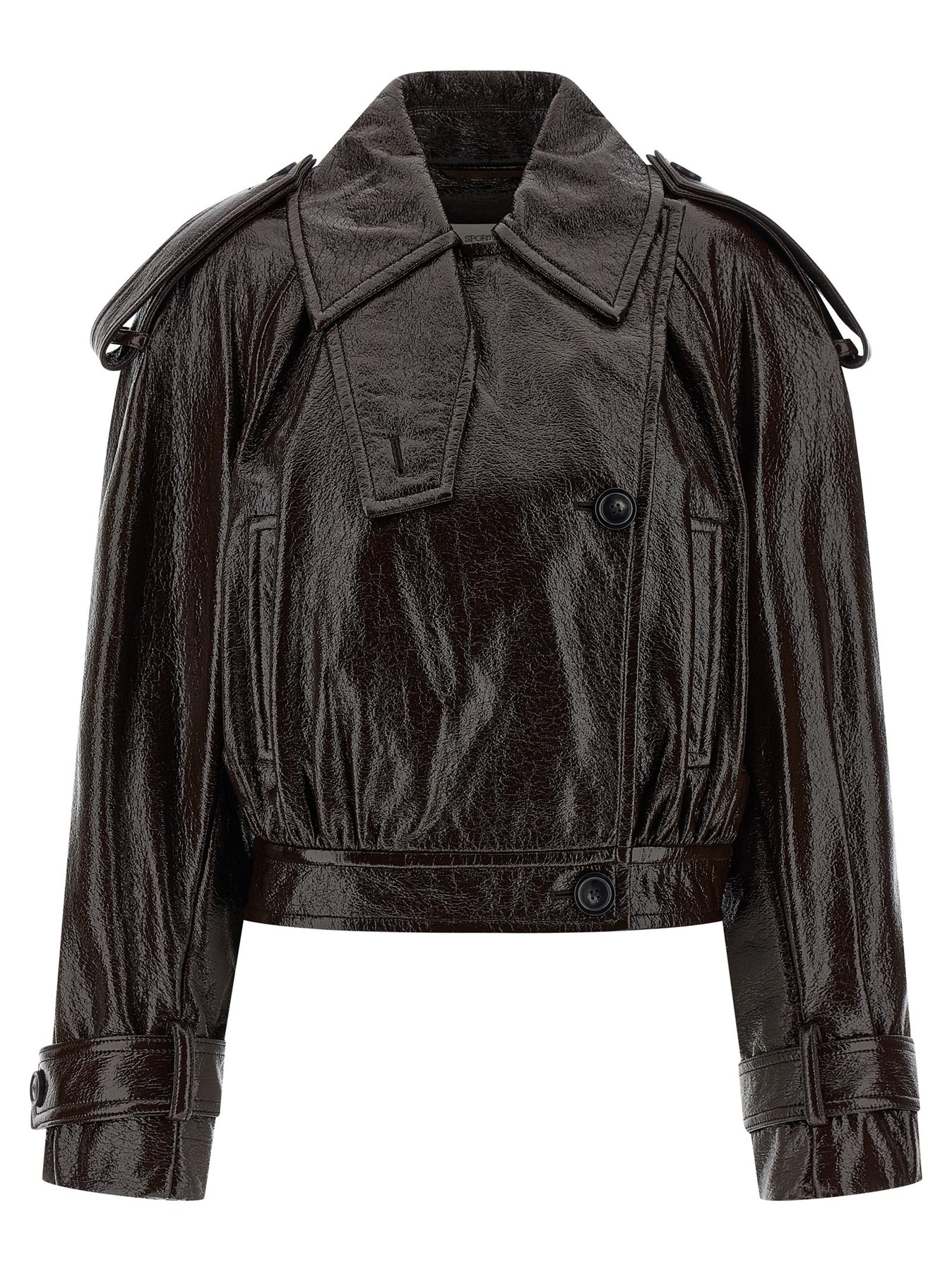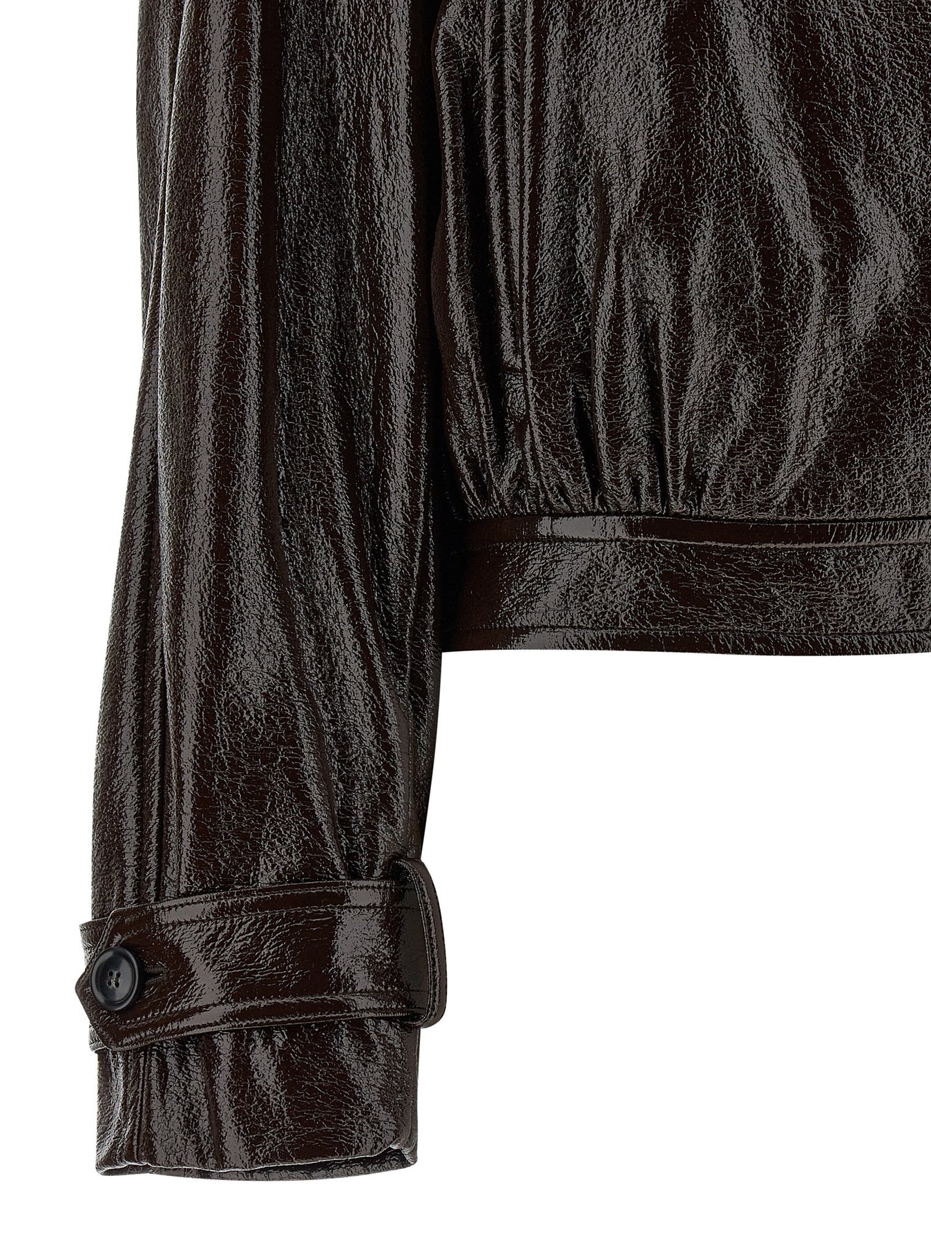 'Beta1234' short trench coat in glossy paint-effect coated cotton, hybrid construction, shirt collar with underneck, front asymmetric button closure, pockets, long wide sleeves with dropped shoulder and cuffs, waistband.