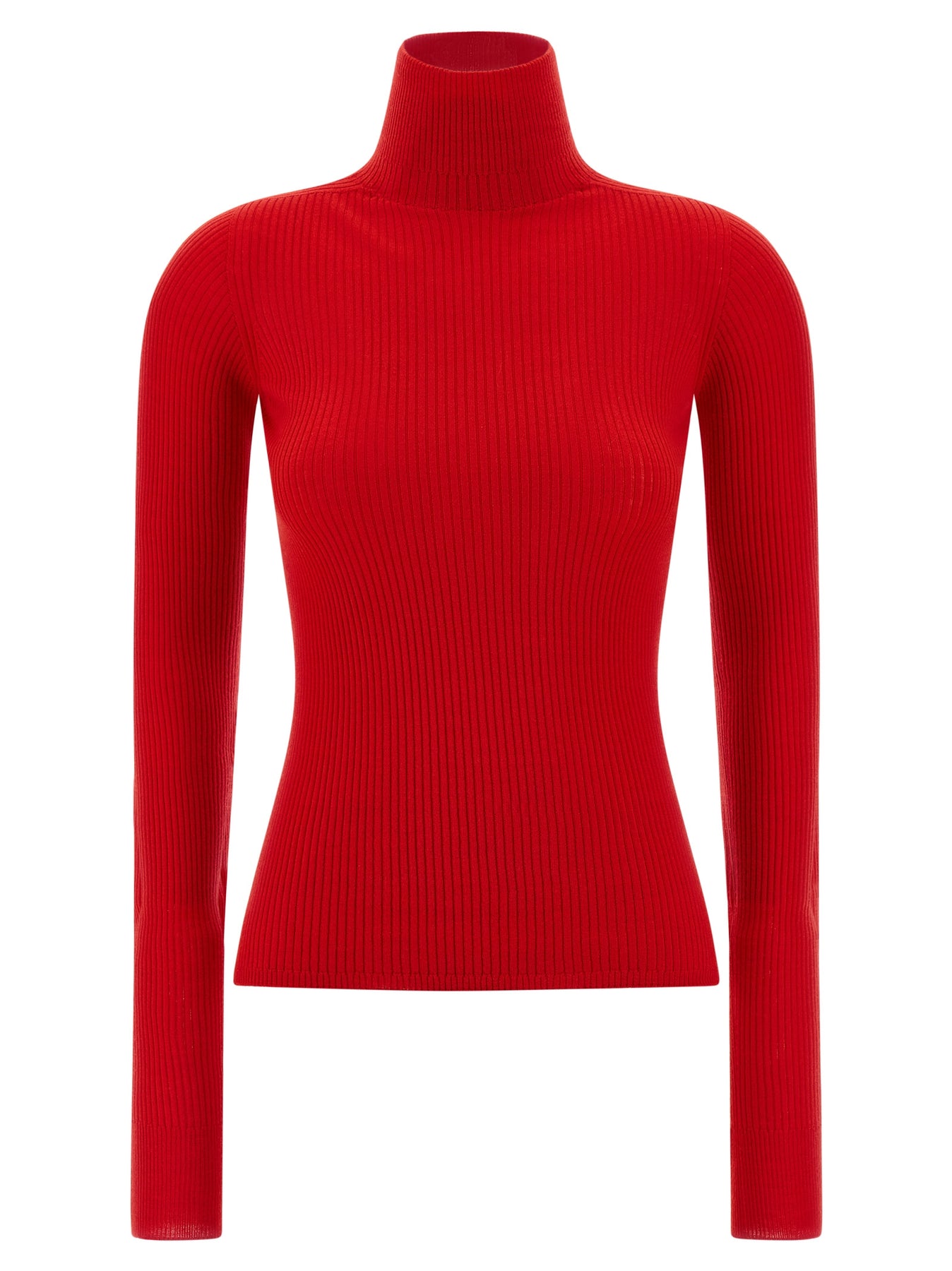 'Niagara' turtleneck sweater in pure virgin wool ribbed yarn, seamless knit, high neck, long cuffed sleeves.