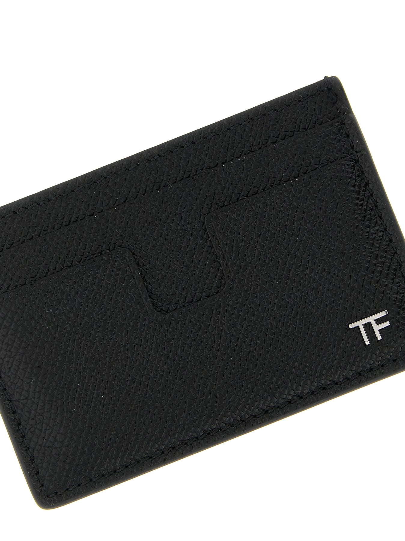 Small leather card holder with front metal logo detail with silver finish.