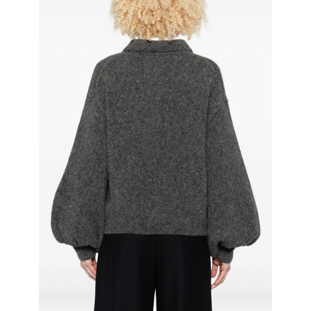 charcoal grey polo neck button placket bishop sleeves ribbed cuffs and hem