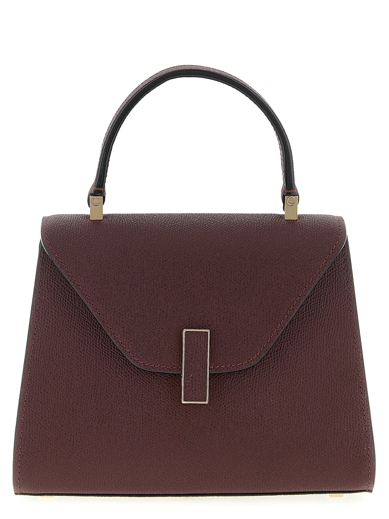 'Iside' mini handbag in Millepunte calf leather, hand-lacquered Costa Valextra piping, fixed handle, flap closure with metal spin, rigid base with metal feet, adjustable and removable shoulder strap.