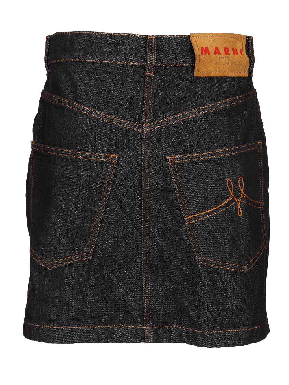 Five-pocket miniskirt in stonewashed denim with tobacco-colored stitching. Daisy-printed reverse denim appliques on the front, embellished with baguette gemstones and a central silver pearl. "M" stitching on the back pocket and a Marni-printed leather patch on the back waistband.