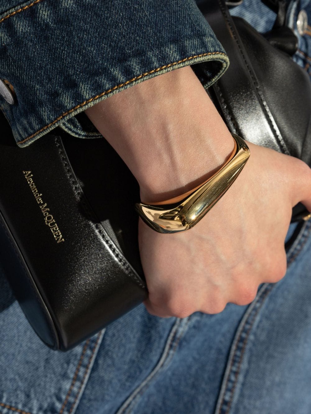 gold-tone brass polished finish engraved logo open cuff design This item contains at least 50% materials which are certified or widely recognised as having a lower environmental impact through production and/or manufacturing processes that reduce water consumption and the use of harmful chemicals, or re-use by-products of the production process. Learn more about what makes a product Conscious on our Conscious Criteria page
