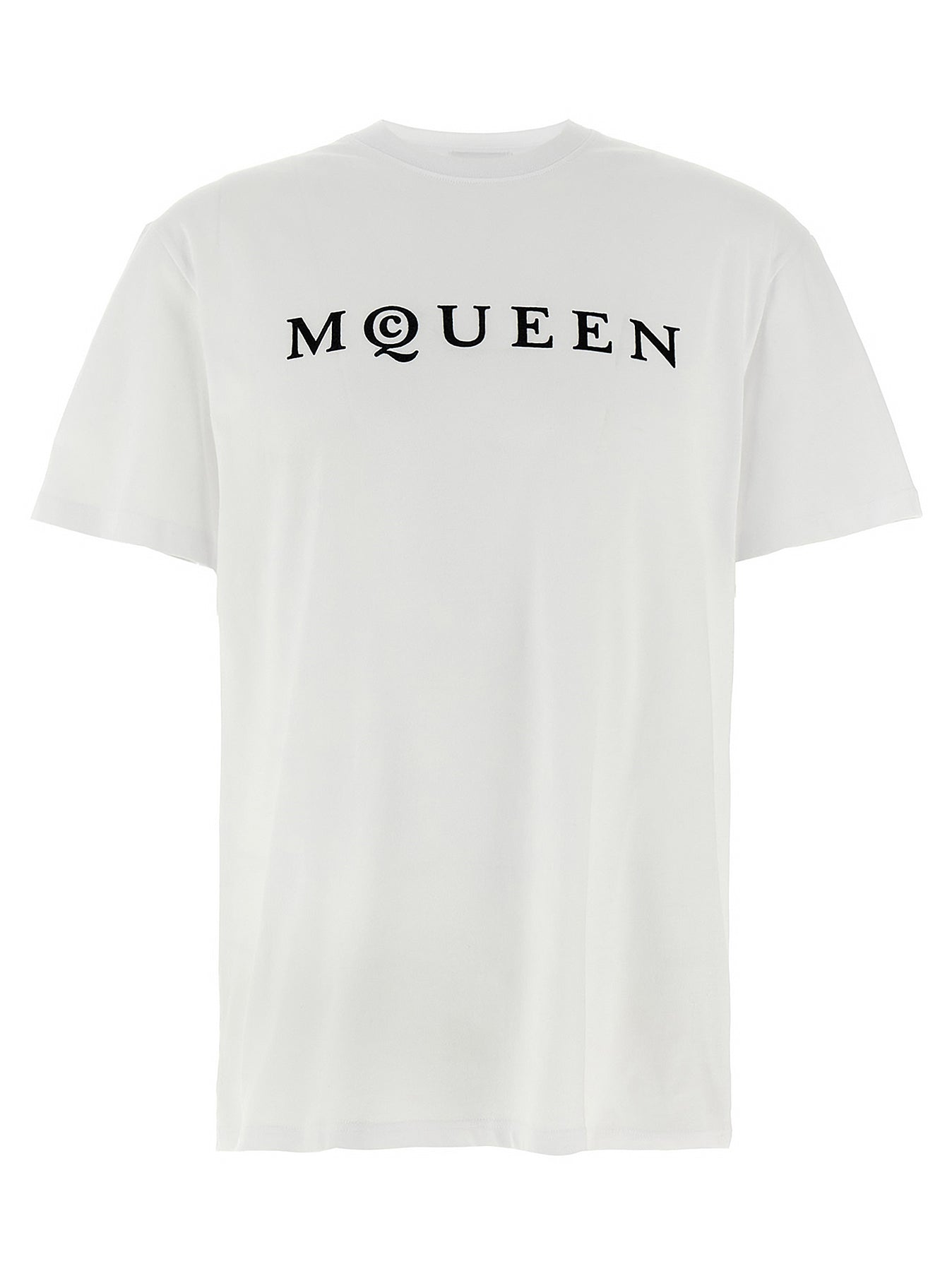 Cotton jersey T-shirt with front flocked 'McQueen' logo, crew neck, short sleeves with dropped shoulders.