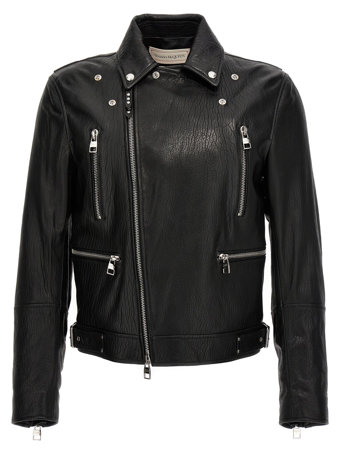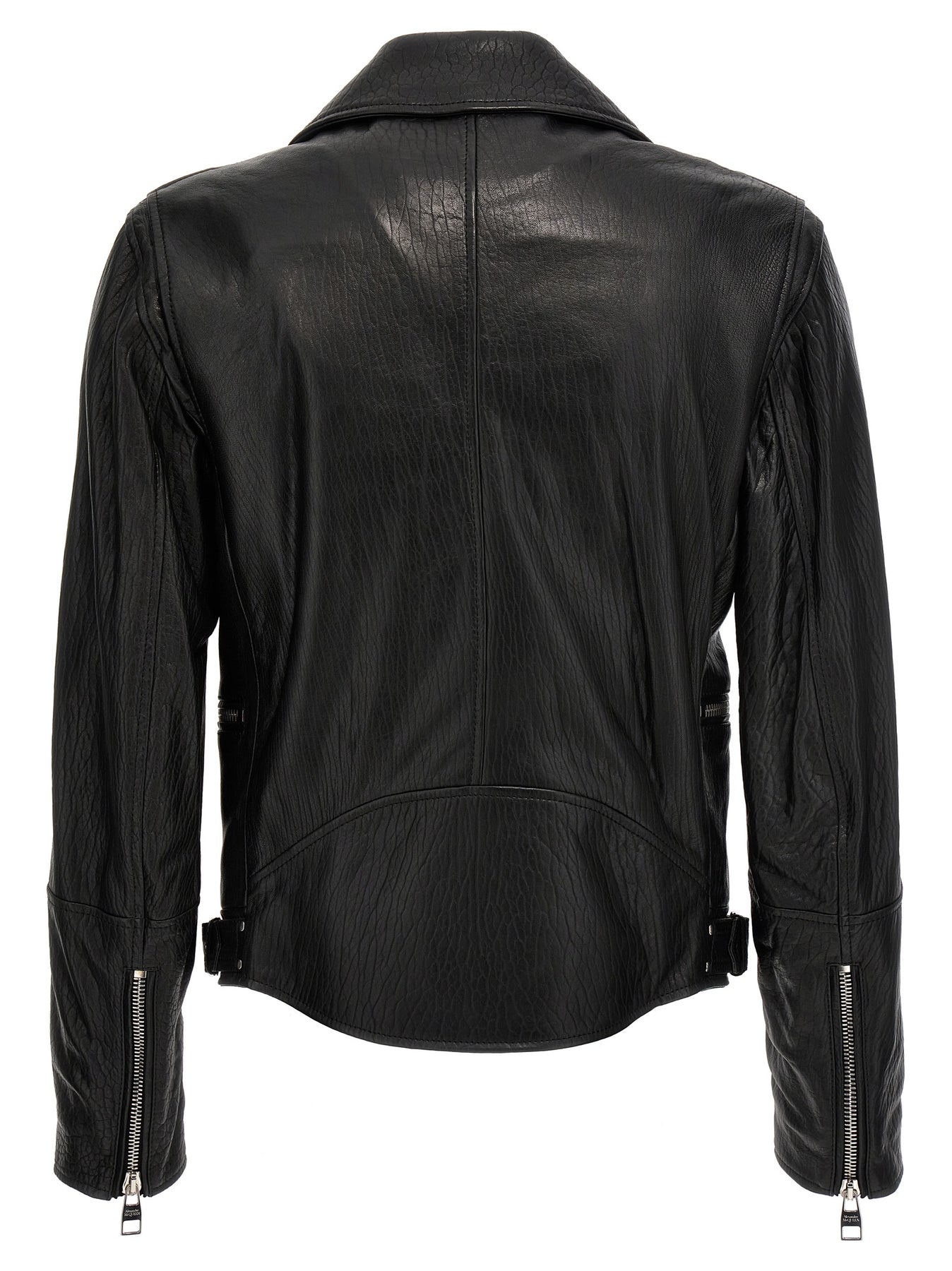 Leather jacket with texture, zip closure, pockets and long sleeves.
