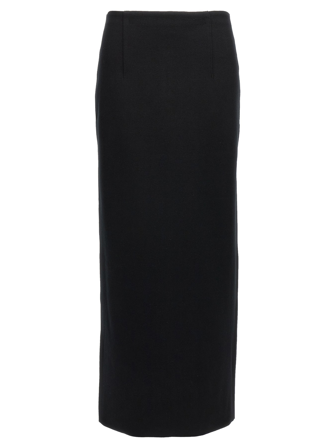 Long double-sided knitted skirt in yarn dyed with Supima cotton blend and silk with brushed finish and an elasticized yarn back, split and back zip closure.