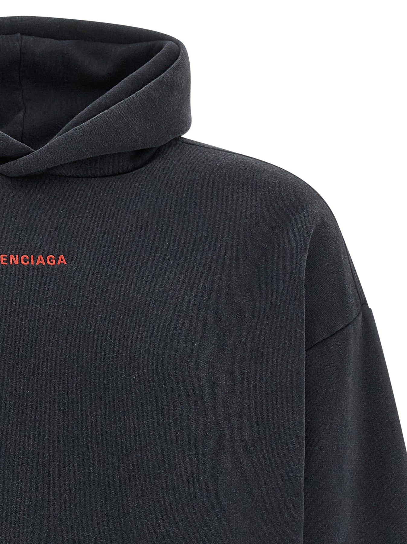 Dry faded fleece hoodie with Balenciaga Back embroidery, kangaroo pocket, long cuffed sleeves and dropped shoulders.